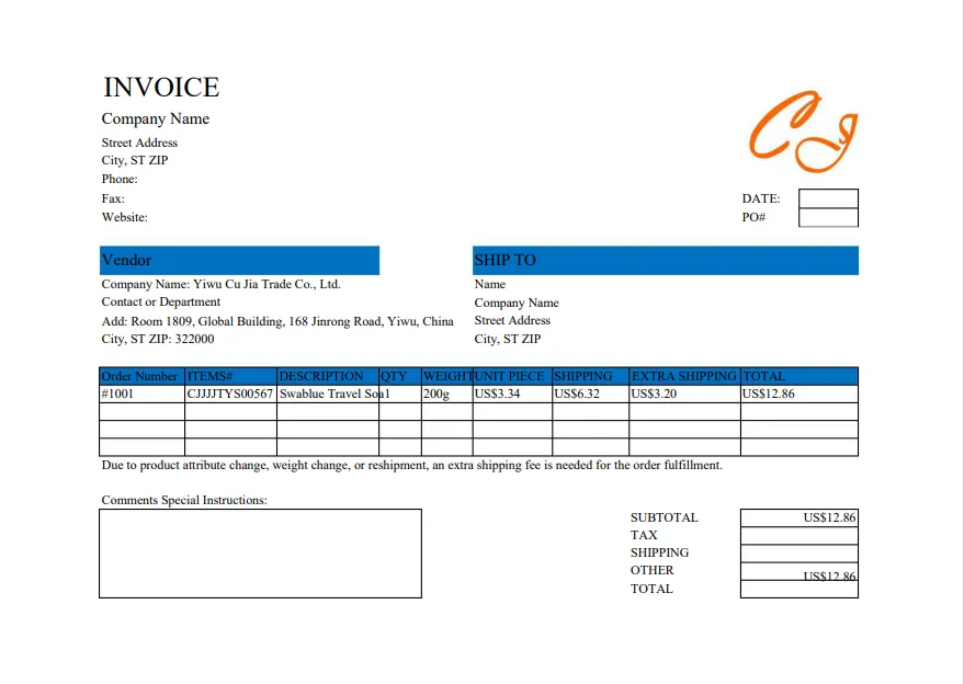 To make the extra shipping fee clear, we will provide an invoice template for you to fill in the order number, product information, shipping cost change, etc. It will also help with the account checking, as well as the bill information on your payment account.