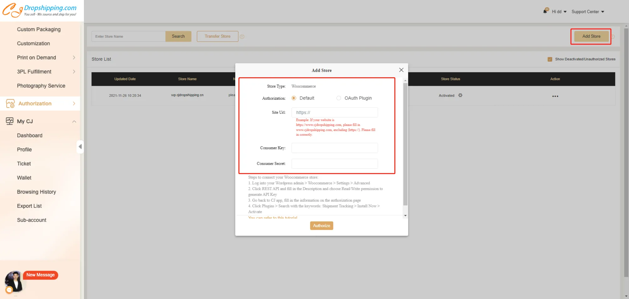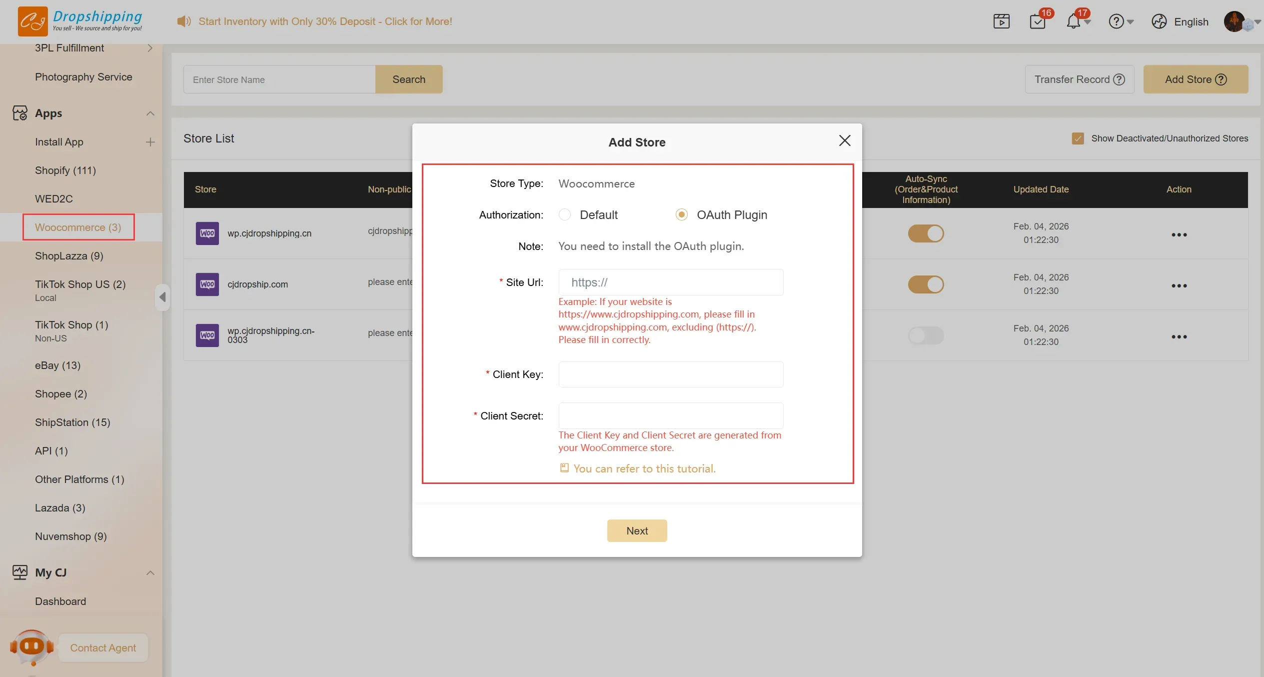 WooCommerce can be well-integrated with CJ, and you're allowed to authorize your store on CJ by default. Moreover, it's viable to authorize your store with OAuth Plugin. After the authorization, you'll be able to list products to your store and import orders to CJ.