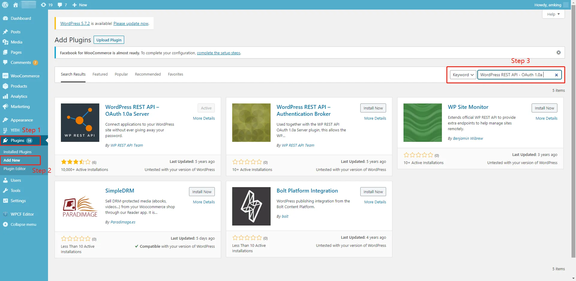 1. Find the OAuth Plugin on WooCommerce Admin and install it;