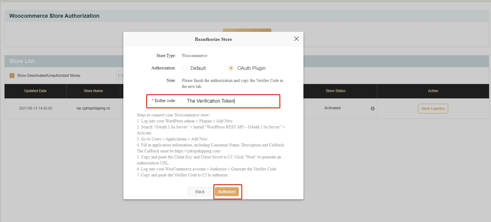 4. Log into your WooCommerce account > Authorize > Generate a Verifier Code.