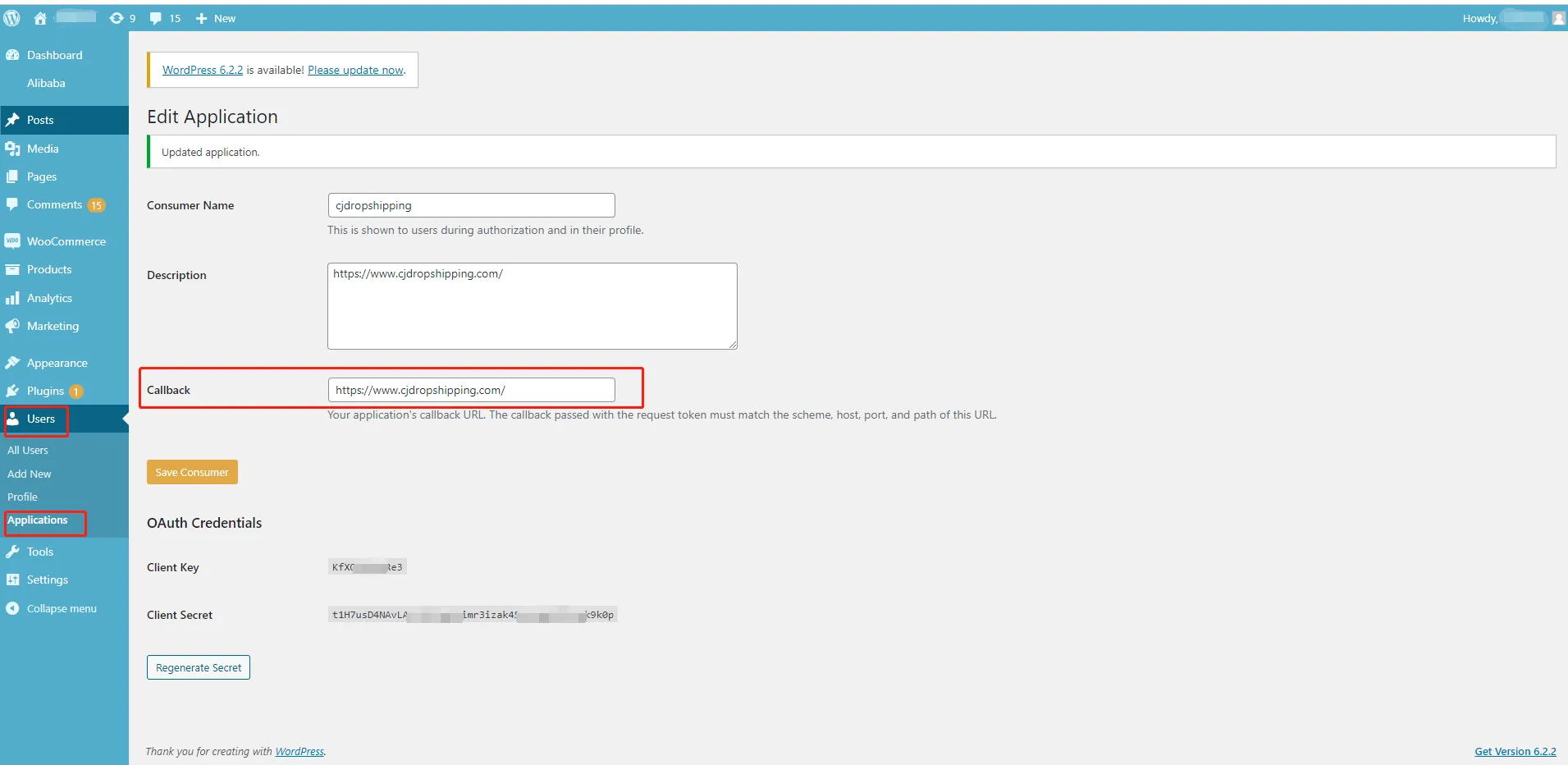 2. Go to Users > Applications > Add New "1.0a Server” > Activate. Then fill in the application information, including Consumer Name, Description, and Callback. And the Callback must be "https://cjdropshipping.com/". Finally, remember to save the information you've filled in.