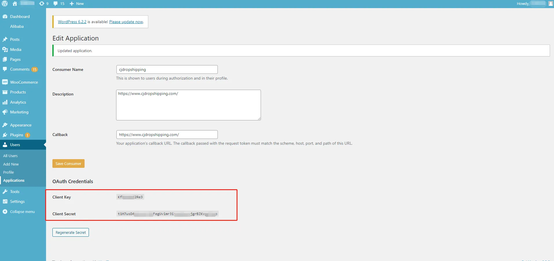 3. Copy the Client Key and Client Secret, then paste them to CJ.
