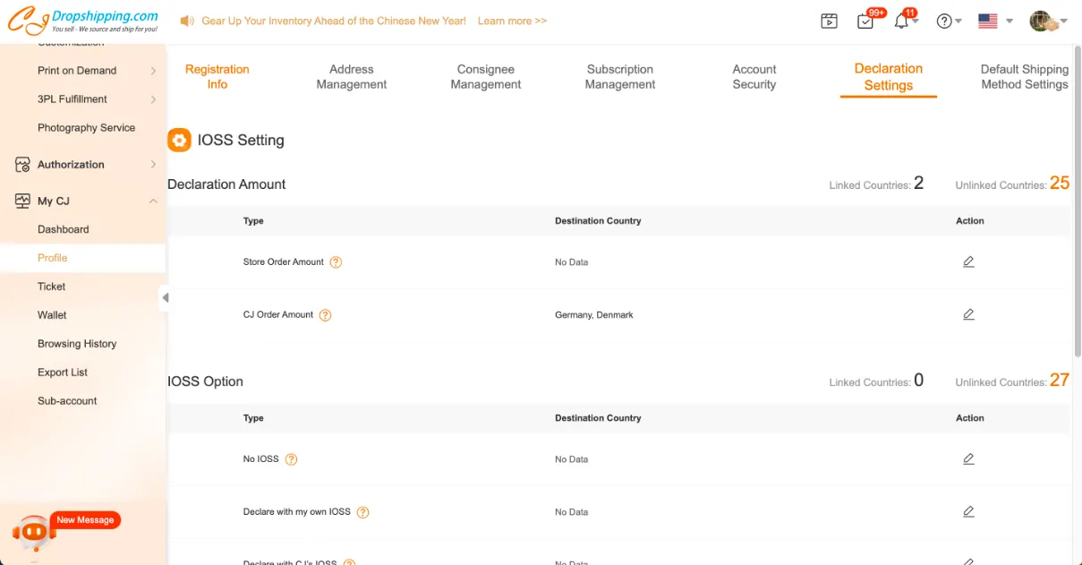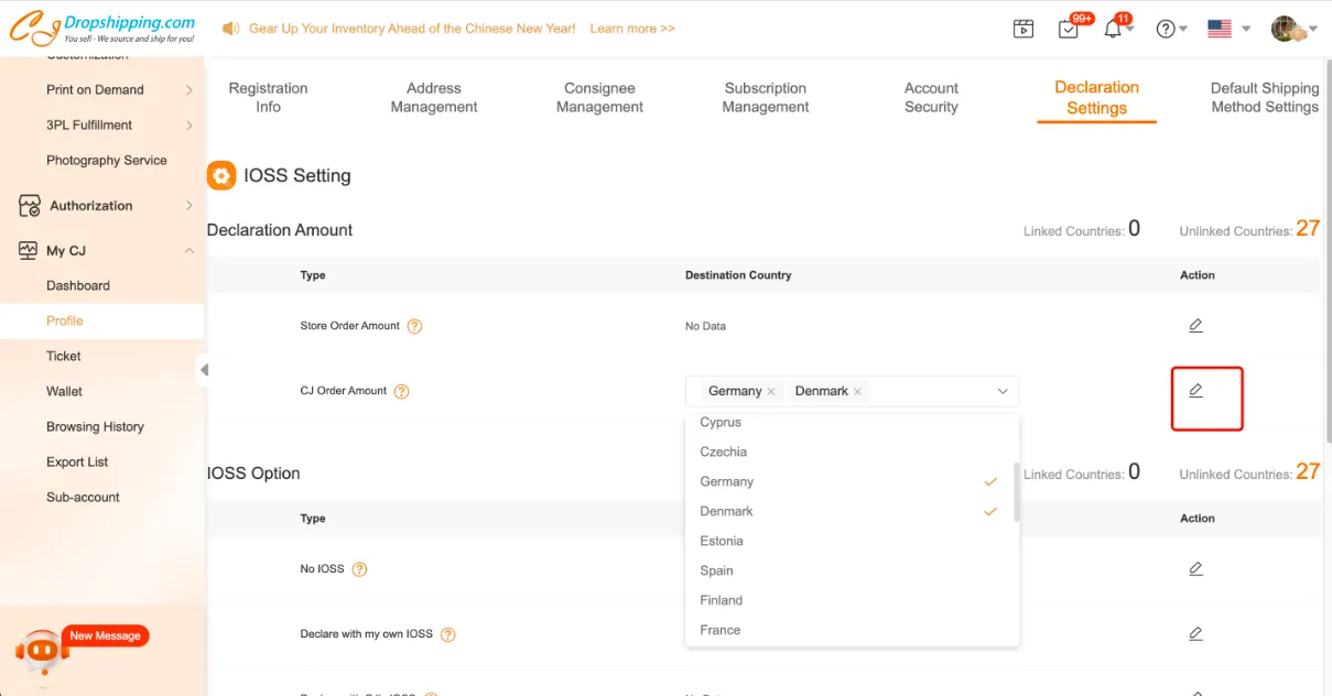 1. Set the declaration amount. You may either declare by Store Order Amount or CJ Order Amount. Let's take the declared amount by CJ Order Amount as an example. Go to the Profile page, > Declaration Settings, click the Edit icon and select the destination countries, such as Germany and Denmark. Then, all orders shipped to those countries will be declared by CJ Order Amount.