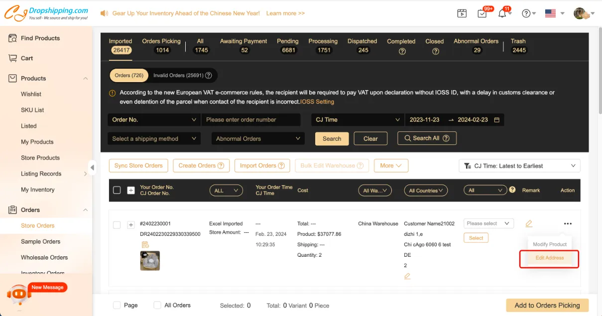 * For orders that were synced before setting up IOSS numbers, you may click the "..." under Action > "Edit Address", then scroll down to find the IOSS Option.