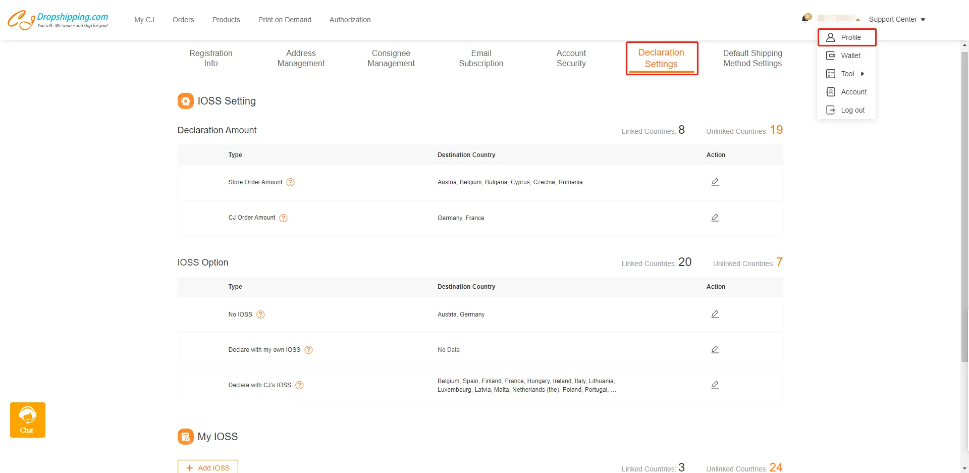 Before you import orders of EU countries to CJ, you would need to complete the Declaration settings > IOSS settings on our platform.