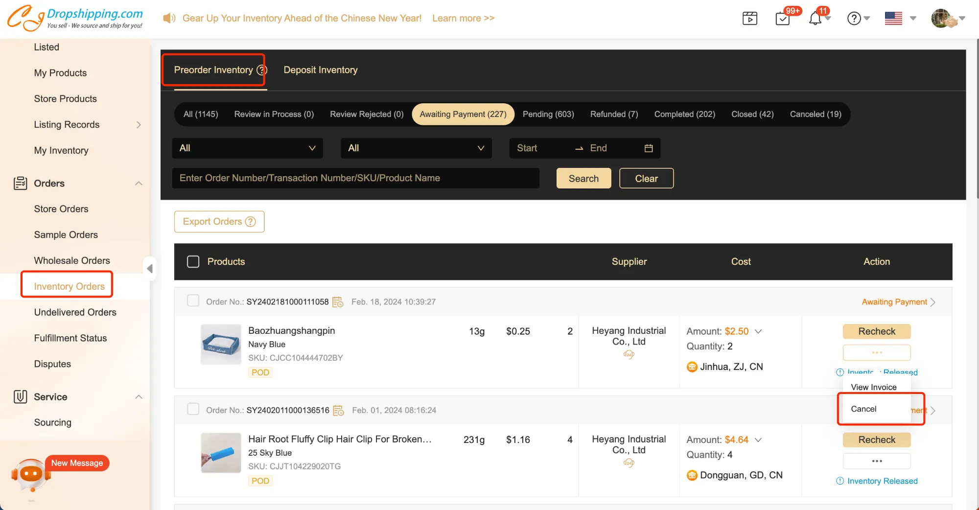 1. As long as your order has not been paid, you could go to Orders > Inventory Orders > Preorder Inventory and cancel it directly.