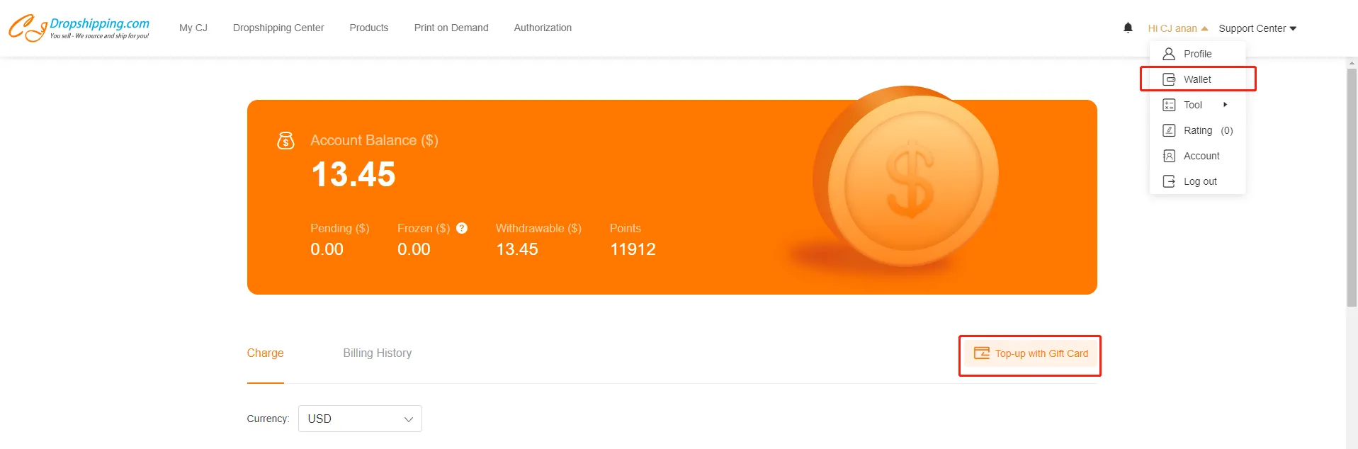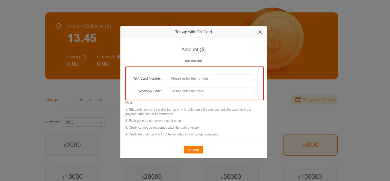 1. You have to go to your wallet to top-up with gift card before going on to the payment. Unlike coupons, the gift card’s amount will be added to your CJ wallet so that you can directly pay your orders using account balance.
