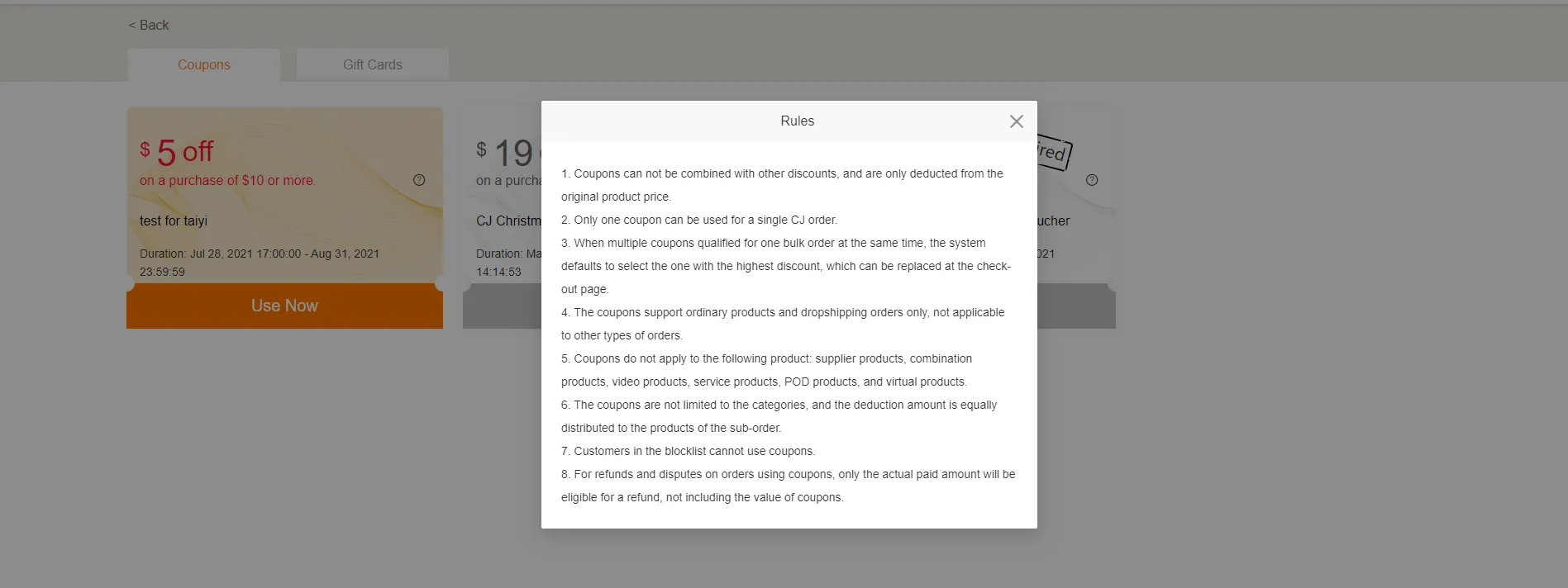 5. Coupons do not apply to the following product: supplier products, combination products, video products, service products, POD products, and virtual products.