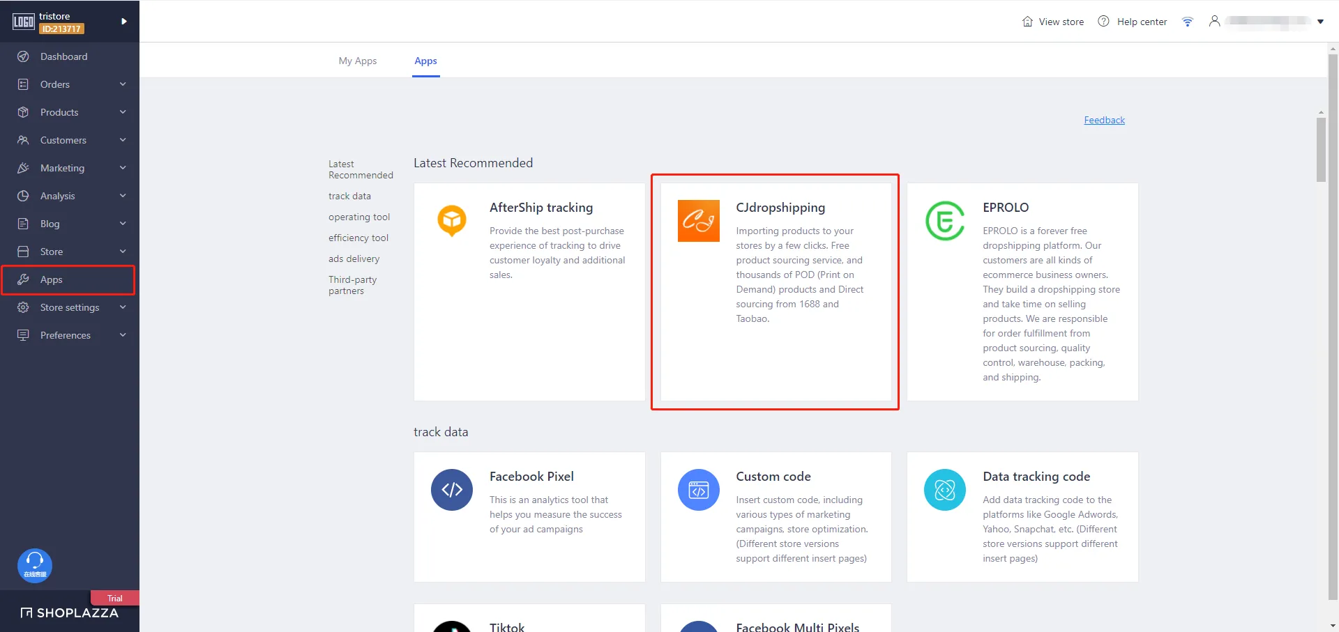 1. Log into your Shoplazza admin, go to Apps > Apps, select 'CJdropshipping'.
