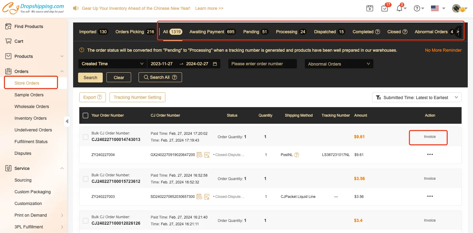 We provide a receipt template with the CJ logo, including SKU, product name, quantity, unit price, etc. You can fill in it as your per order. If the product information is not required, you can directly get the invoice from "Orders > Store Orders-All > Invoice".