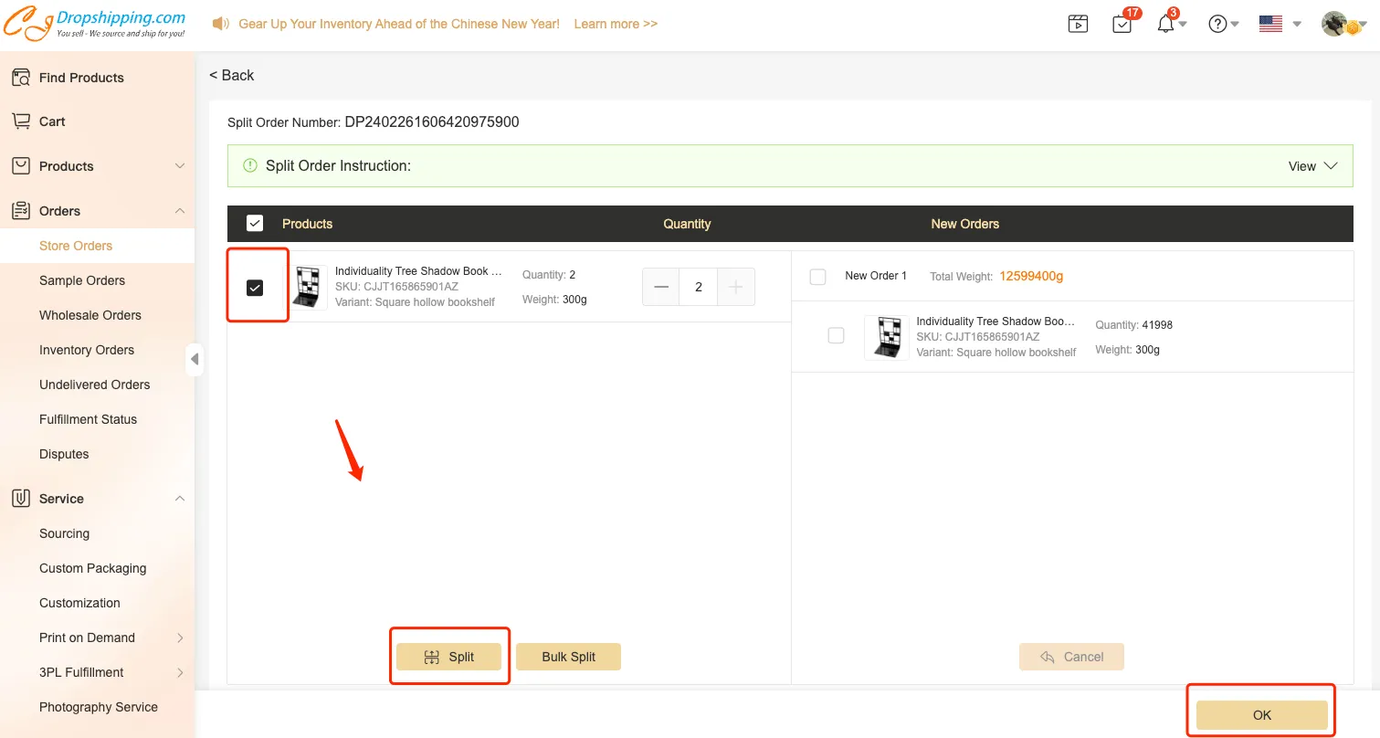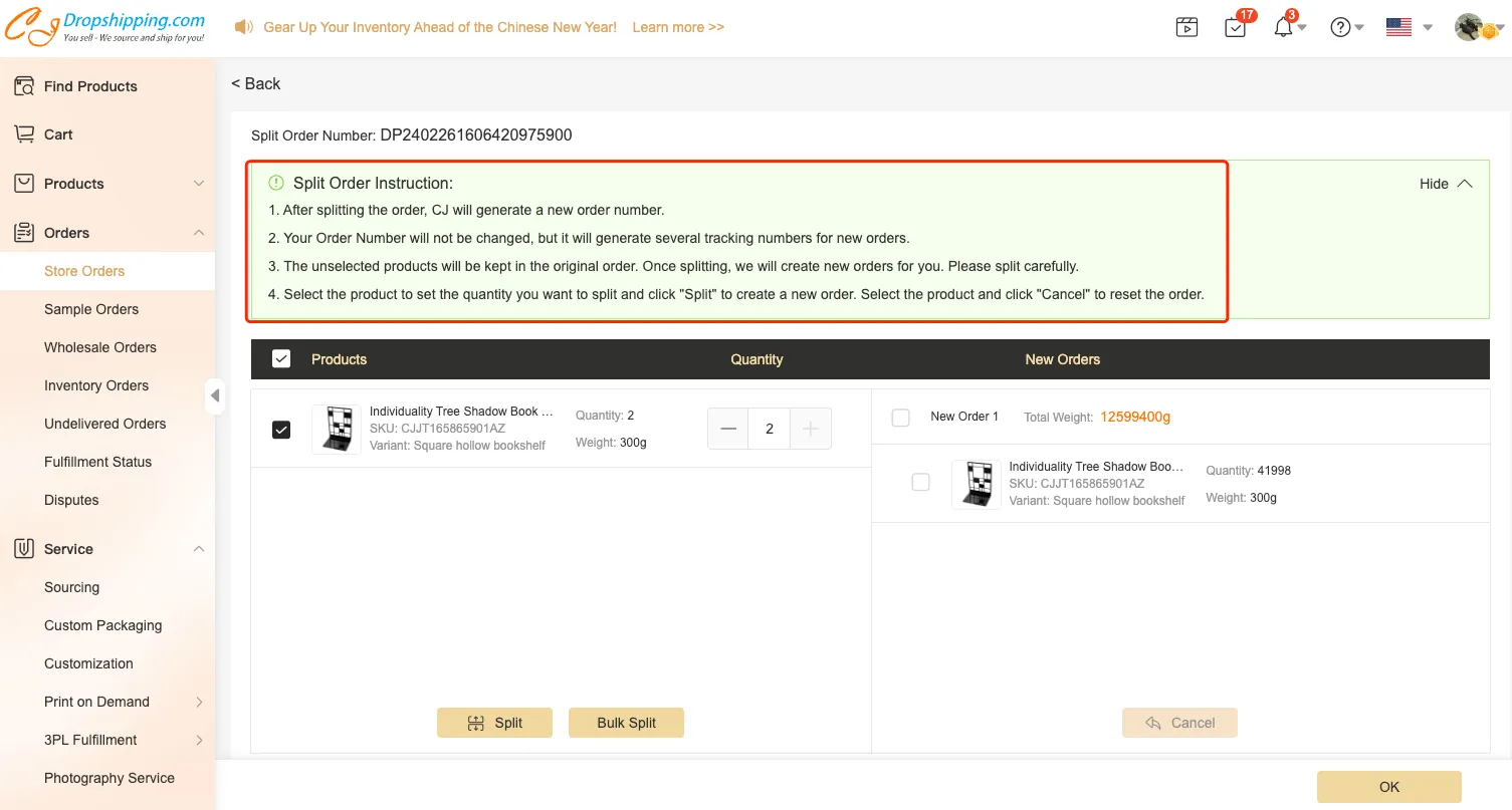 If you want to change the quantity or weight of the package before placing the orders, you can split synced orders on the CJ platform.