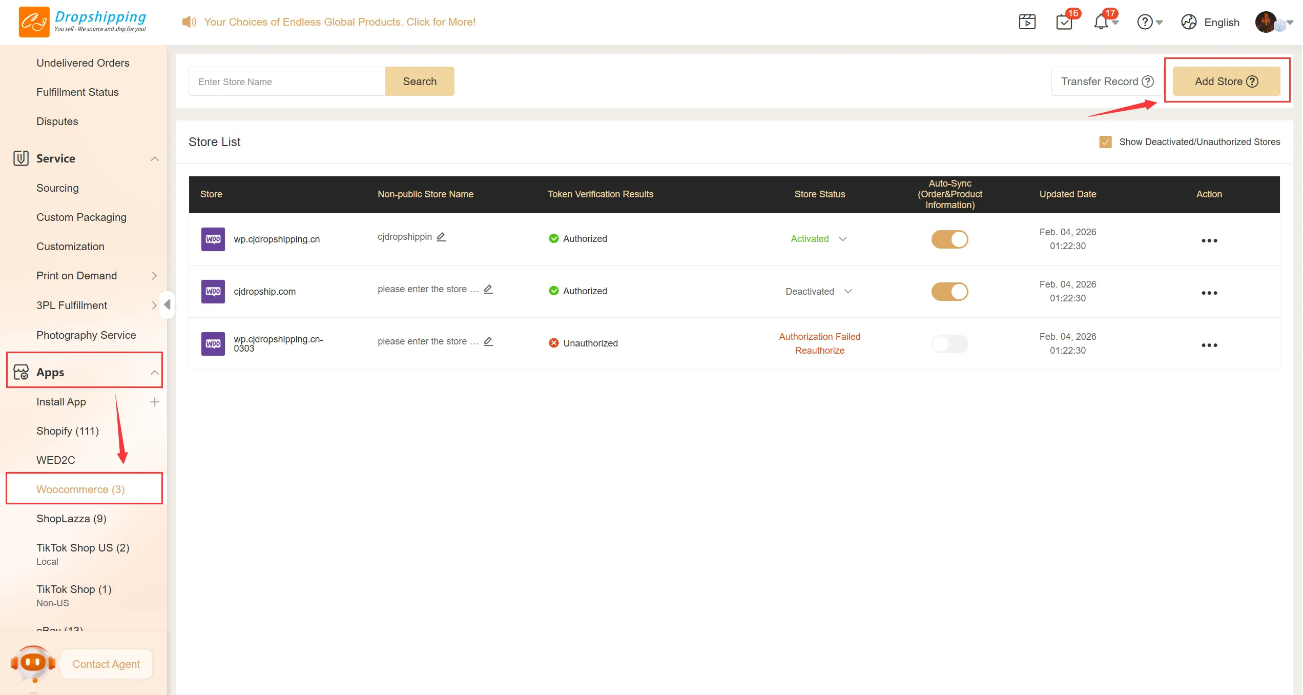 Go to Apps > WooCommerce, and then, click Add Store.