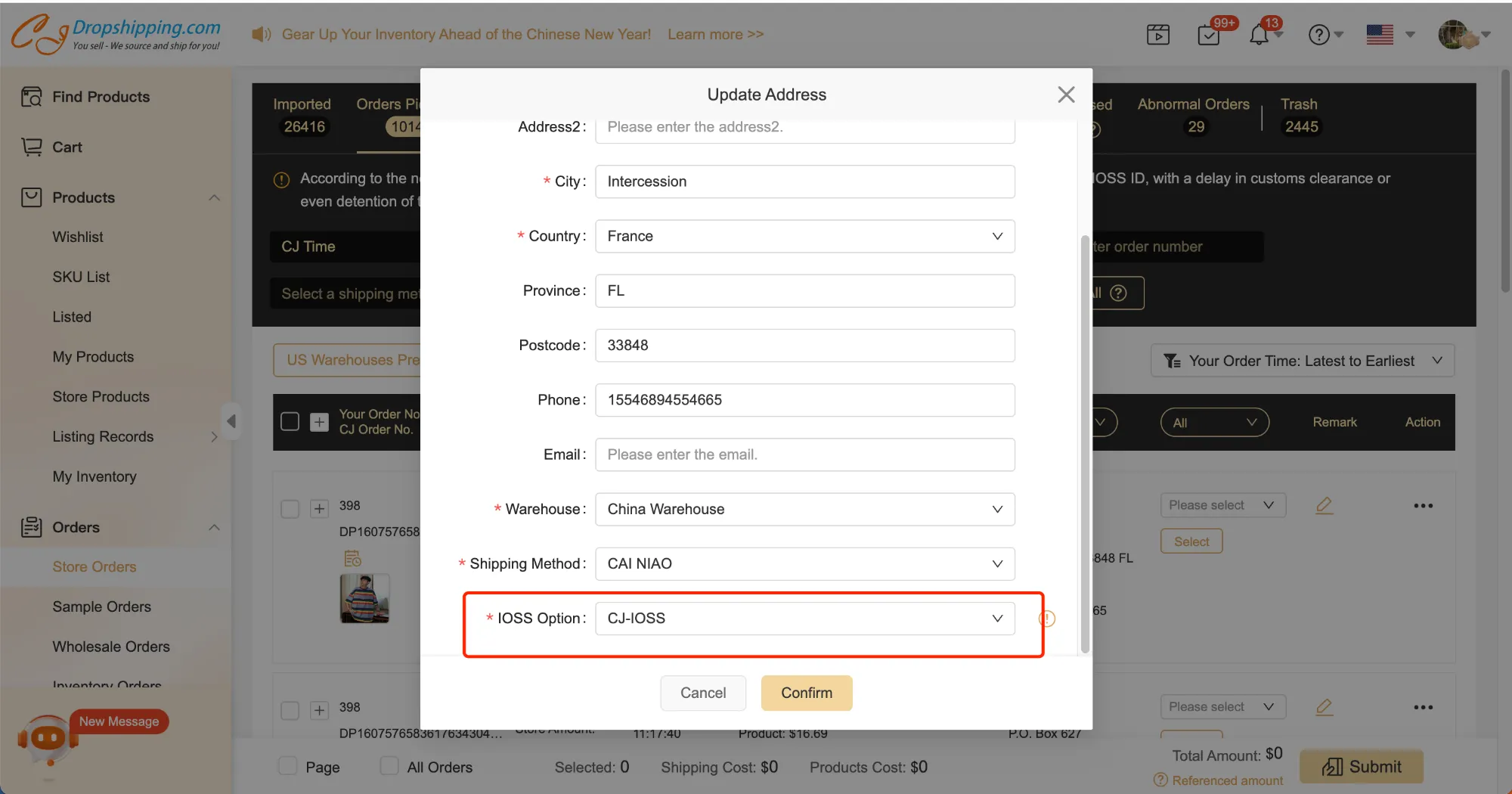 b. If you want to apply the CJ's IOSS, you should set it up in 'Edit Address' after uploading the Excel. Please be noted that you should set the IOSS options in your Profile before setting up.