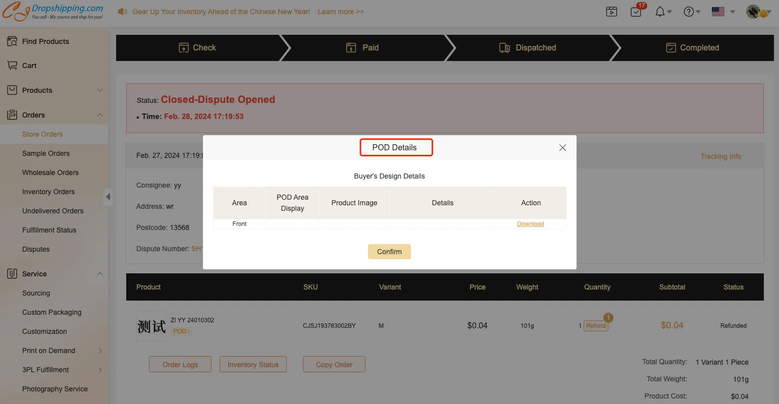 Once the POD orders are imported to CJ, you could check them in the Store Orders. By clicking the order number > POD, you could check the customized texts or images from your clients.