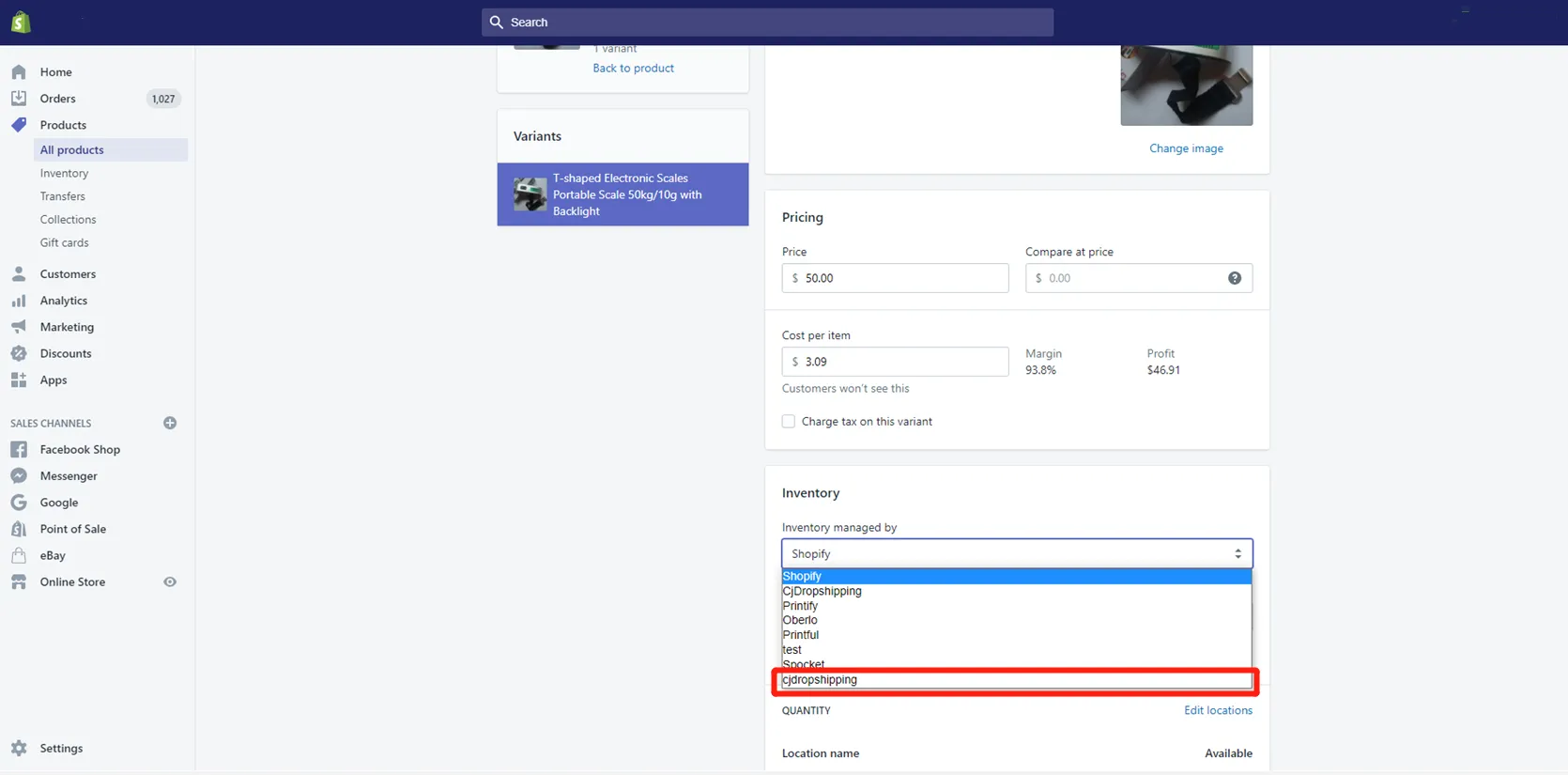 3. Go to Inventory > Inventory Managed by and choose "CJdropshipping" (in lowercase).