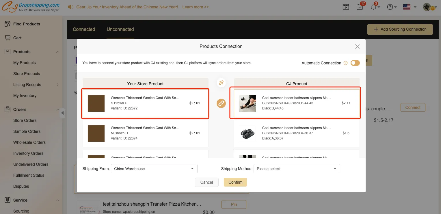 It also applies to connecting a random variant in your store to CJ's specific variant.