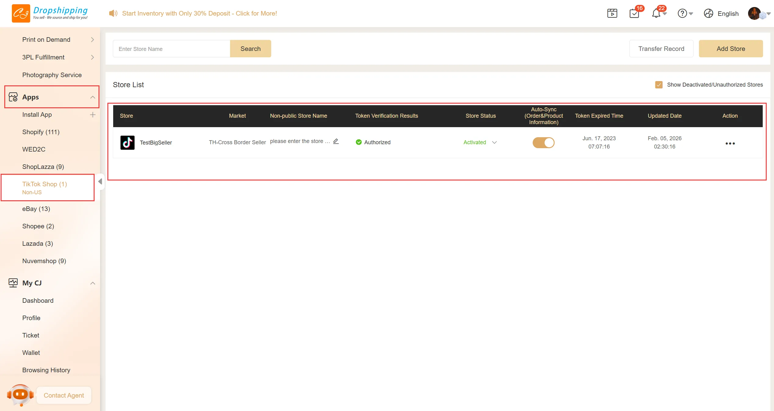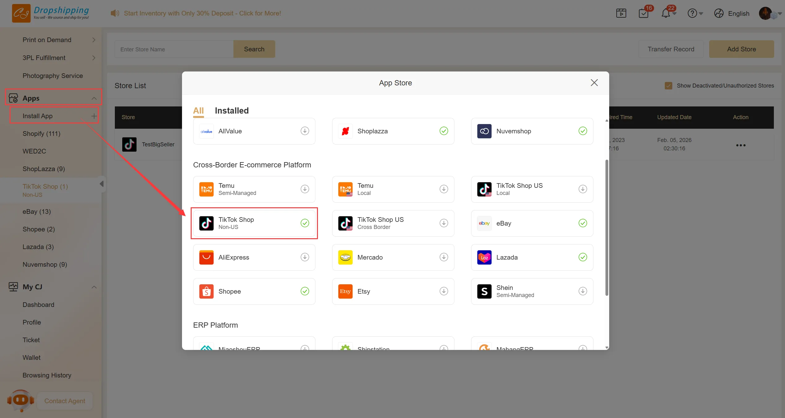 1. Click 'Add Store' in Apps> TikTok Shop Non-US;