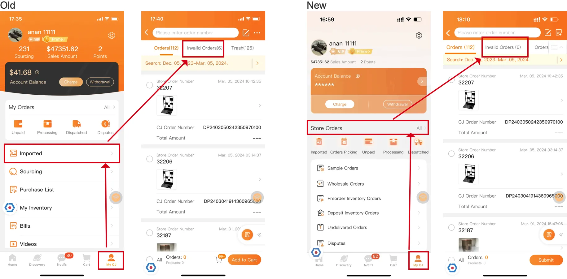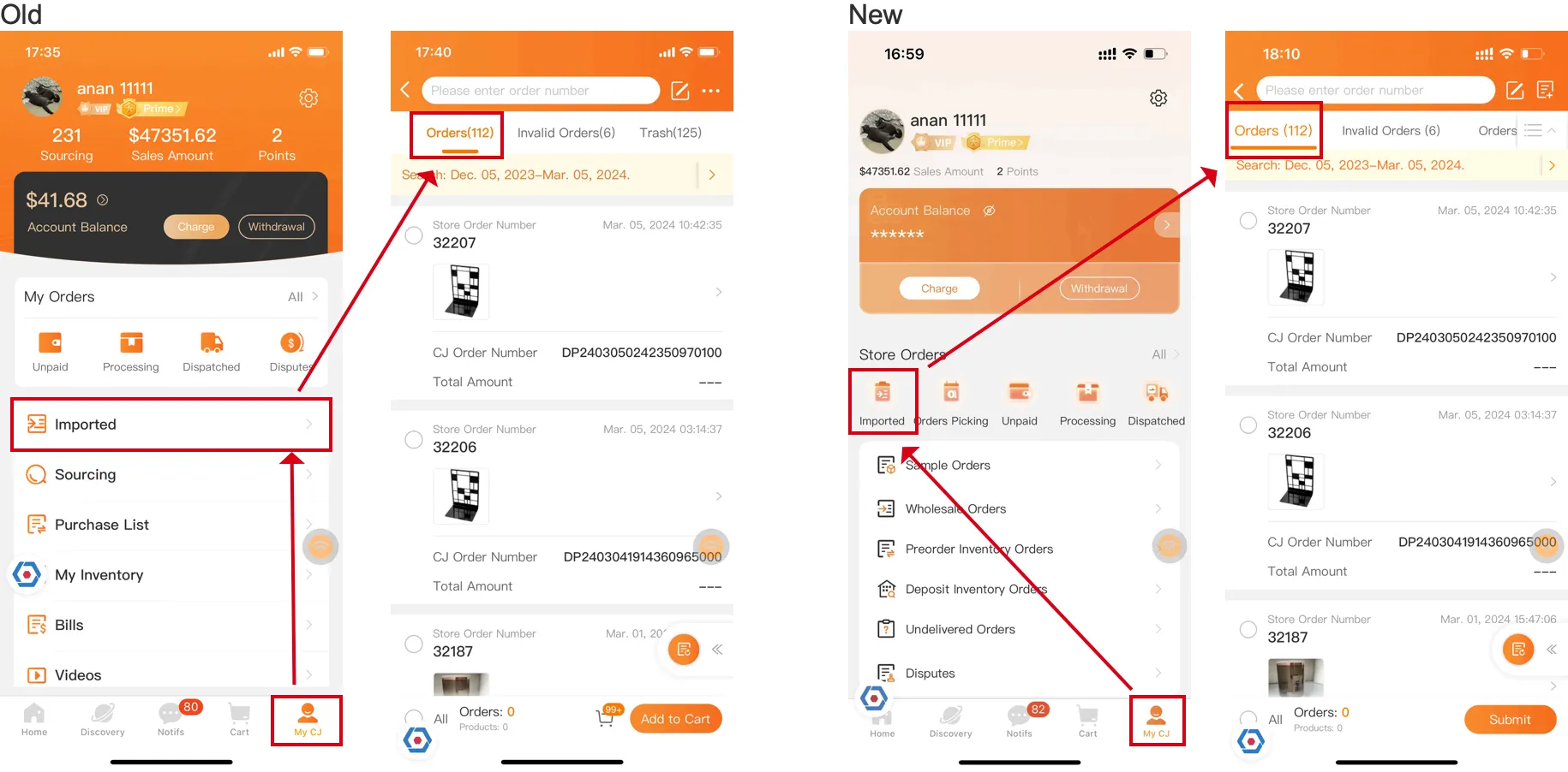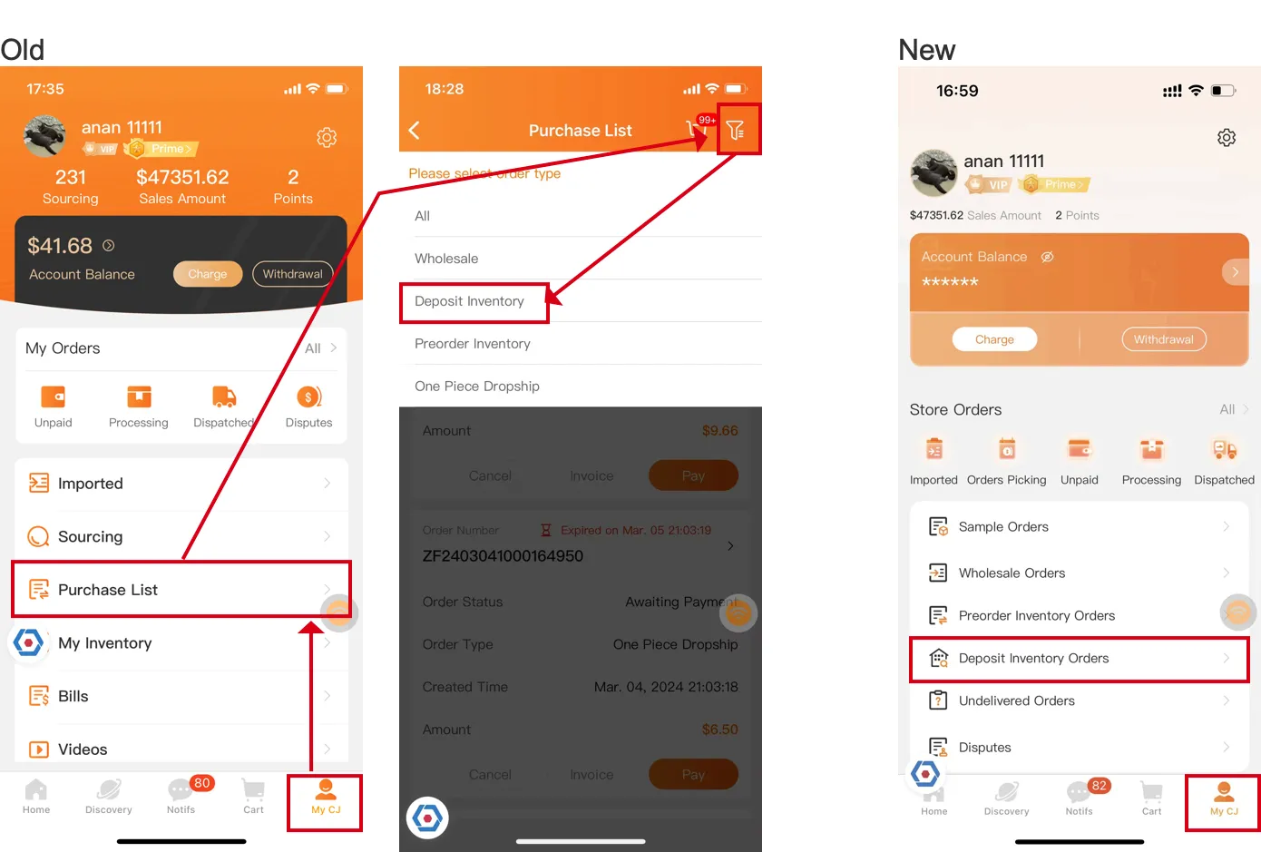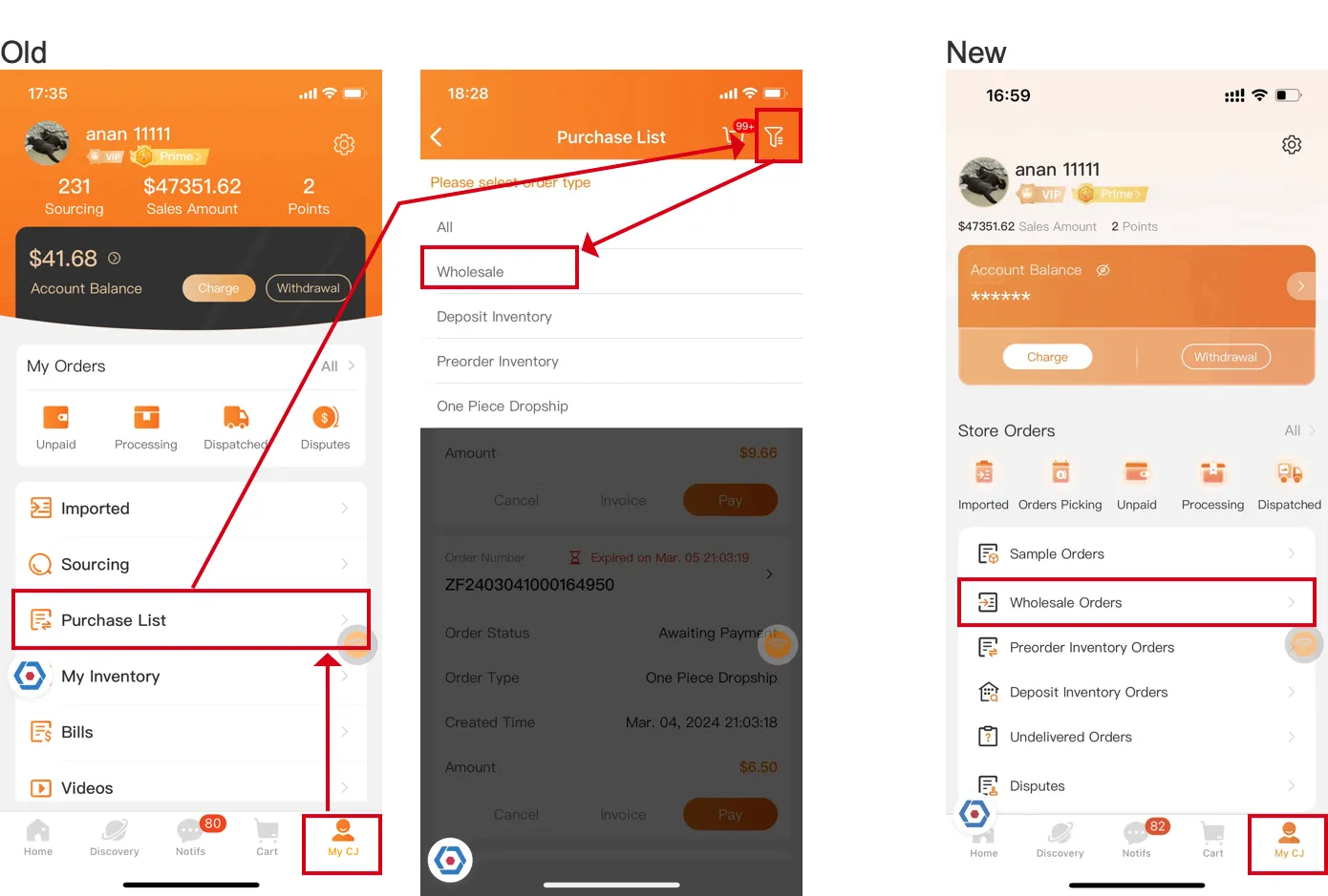 2) Purchase List, Wholesale Orders, Preorder Inventory Orders, and Deposit Inventory Orders has split to "My CJ" menu.