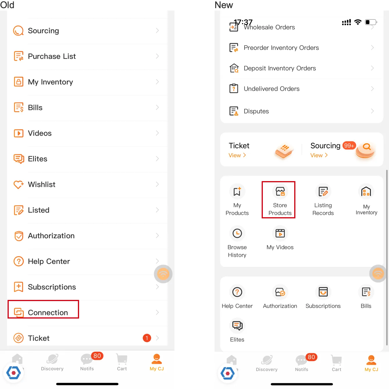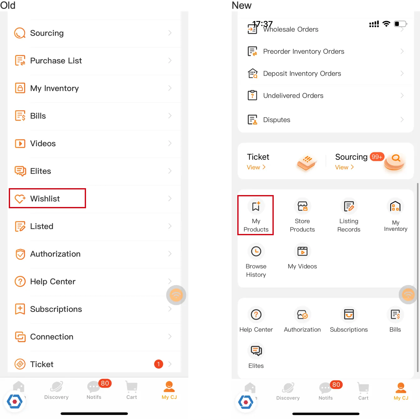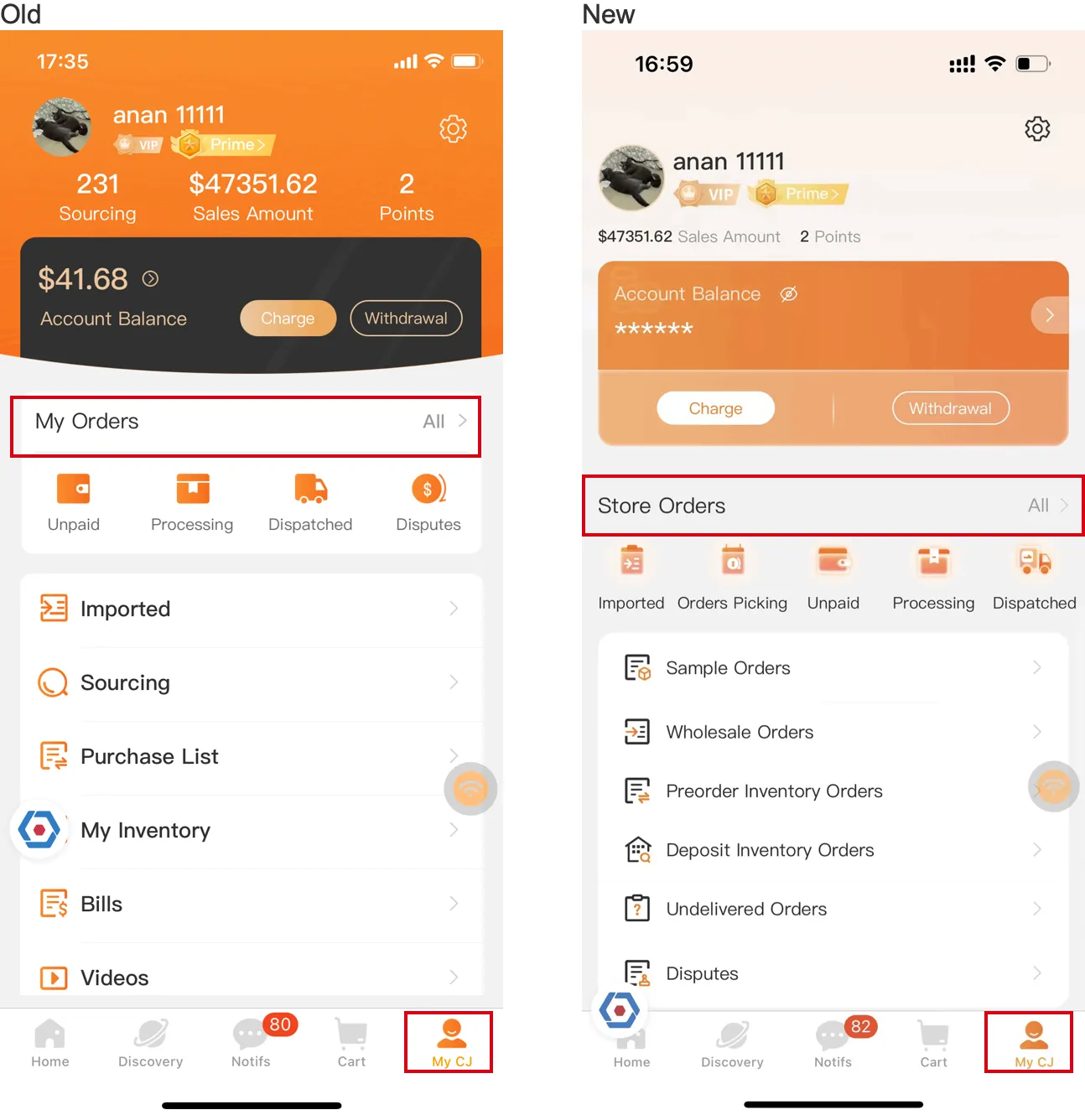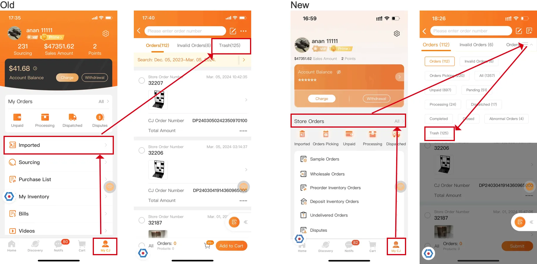 2) Purchase List, Wholesale Orders, Preorder Inventory Orders, and Deposit Inventory Orders has split to "My CJ" menu.
