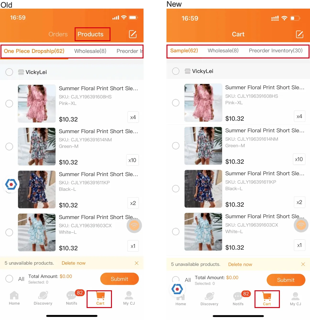When you open the Cart, you can view the products you have added according to the added source (Sample\Wholesale\Preorder Inventory), and then submit the order.