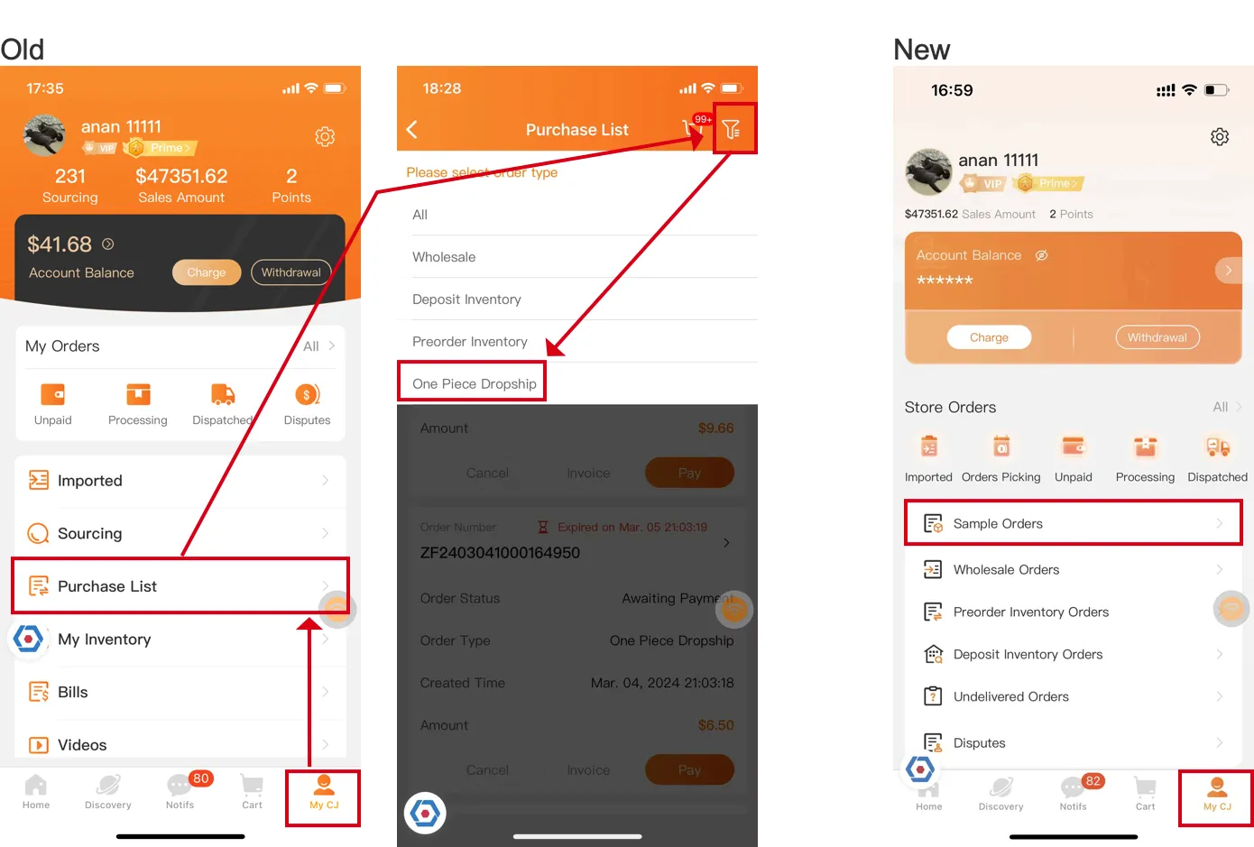 ● Old: MyCJ > Purchase List > Filter Order Type 'One Piece Dropship'