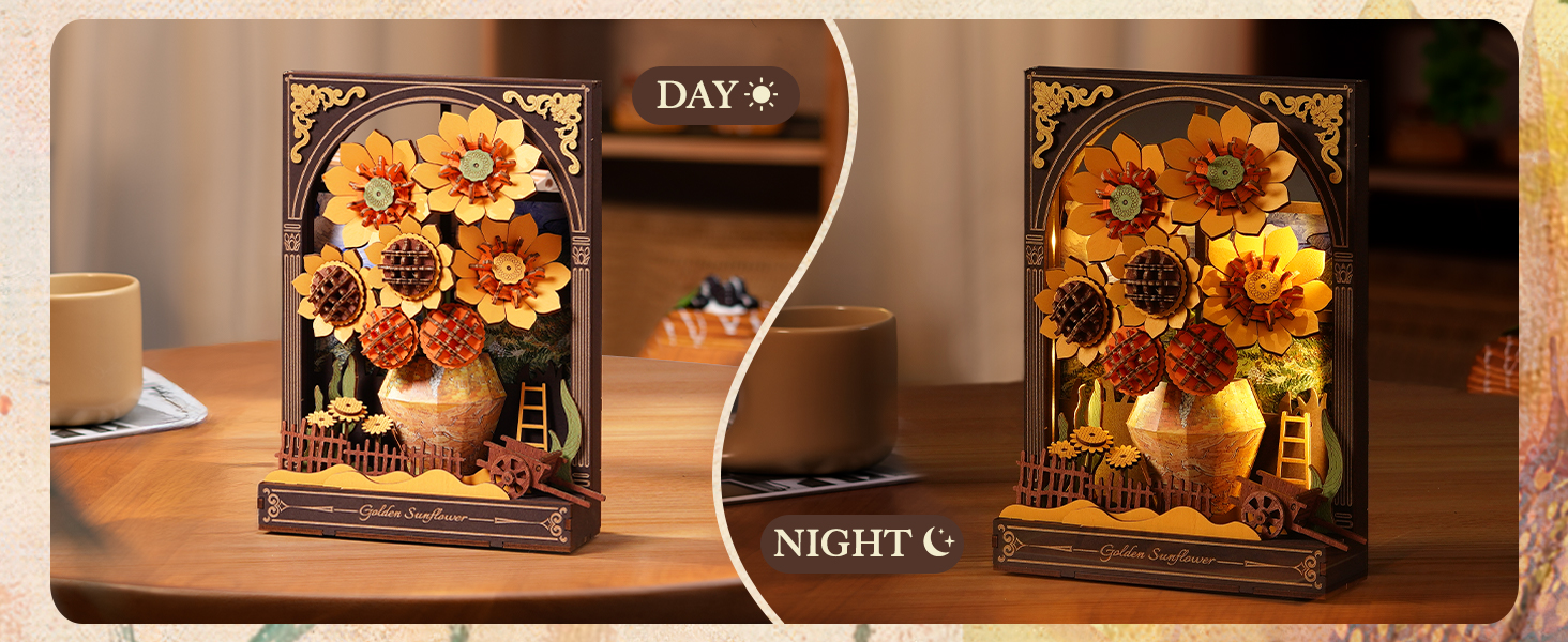Multiple mounting options allow for desktop display or wall mounting. Built-in warm LED lights emit a soft glow, enhancing the floral details and adding ambiance to any space.