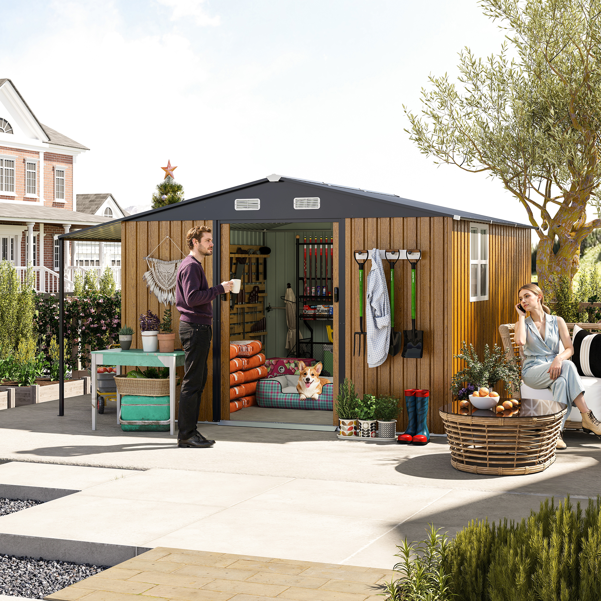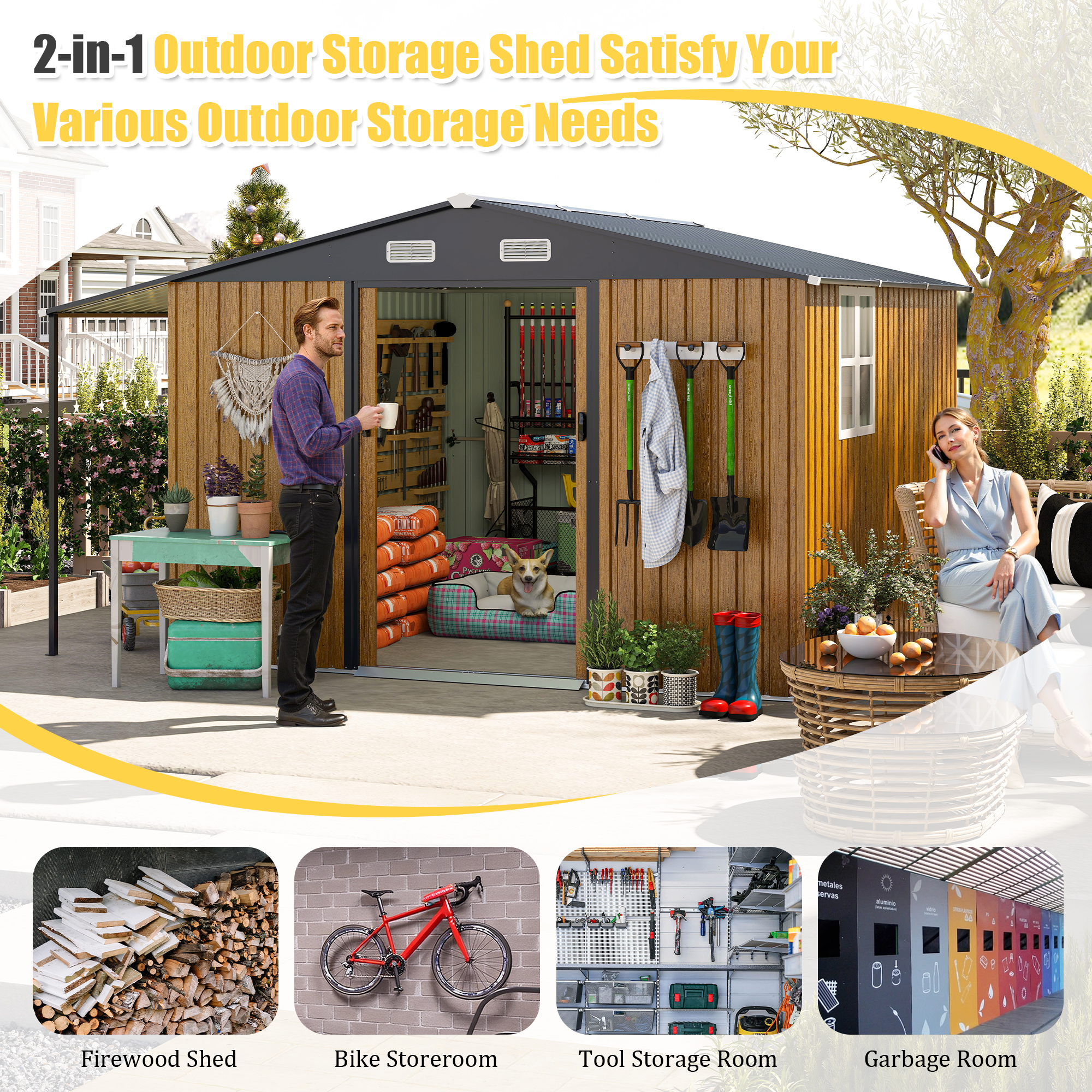Main shed plus open firewood bay keeps tools and logs separated, organized, and dry. Ideal for garden gear, lawnmowers, and seasonal equipment