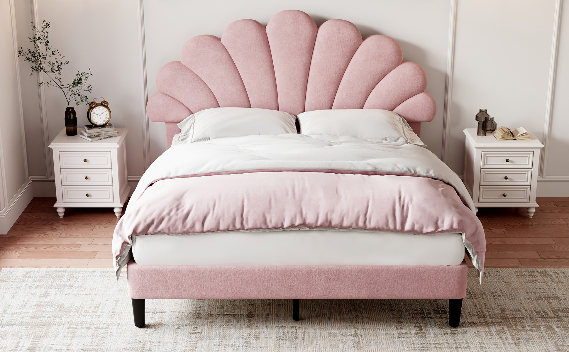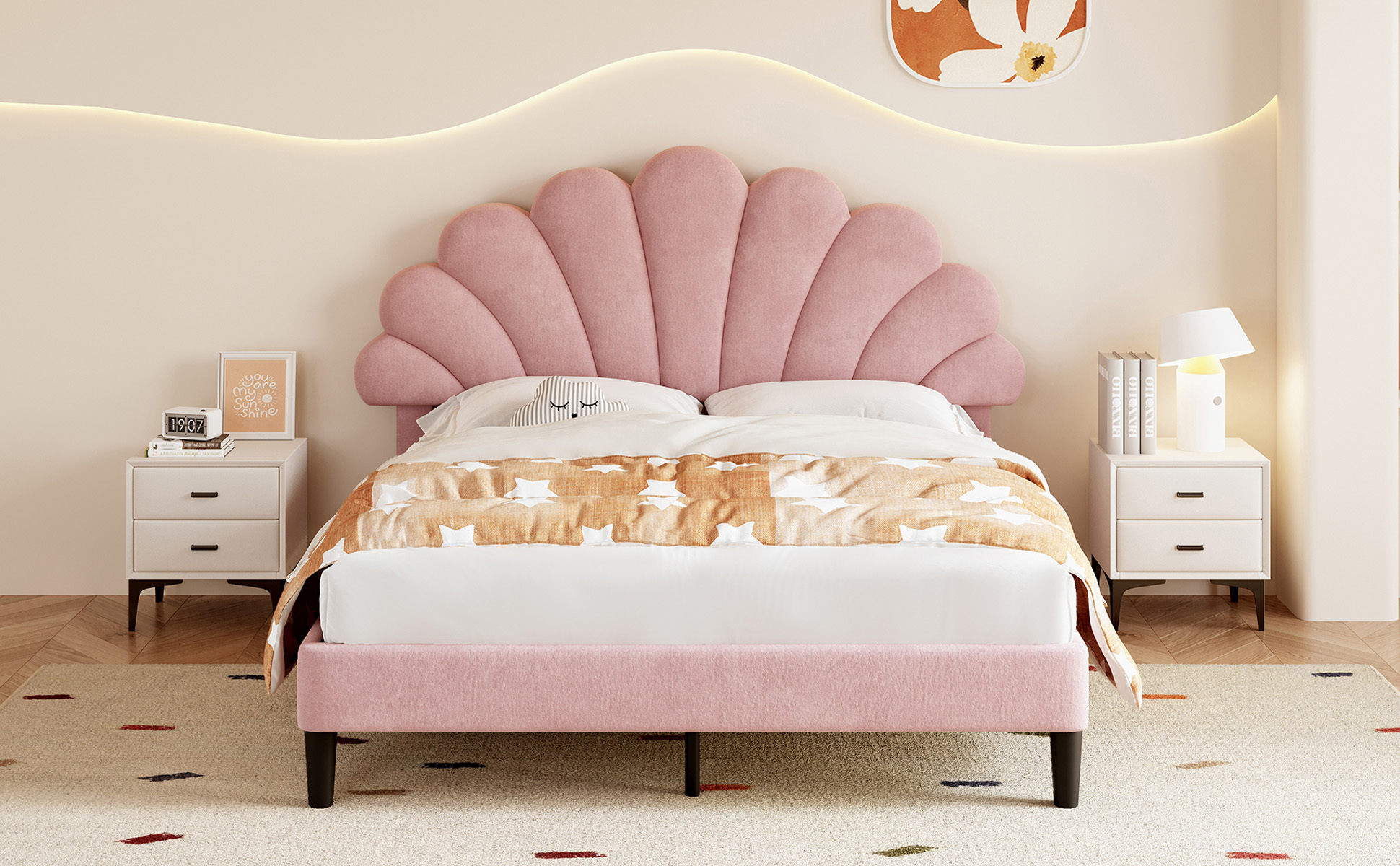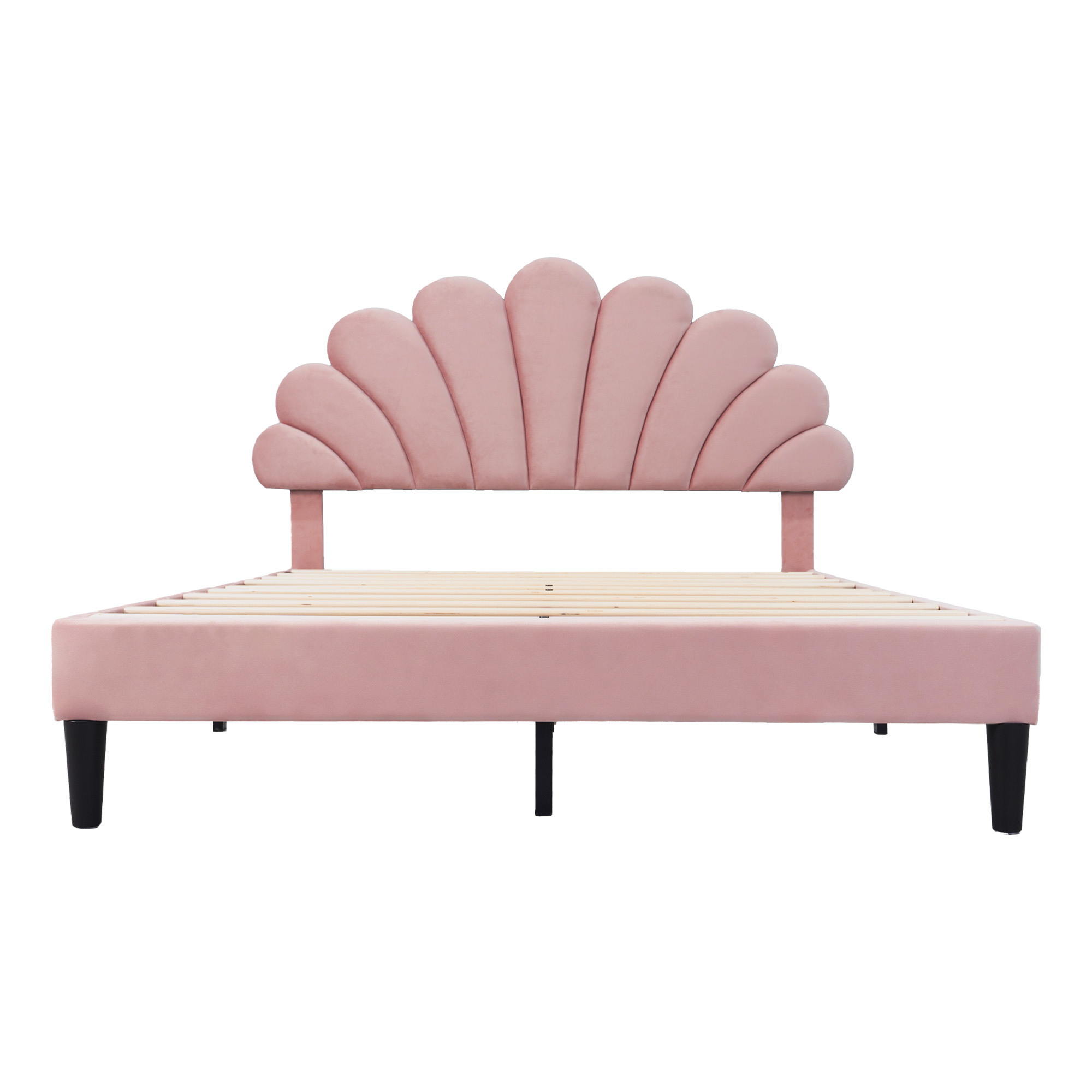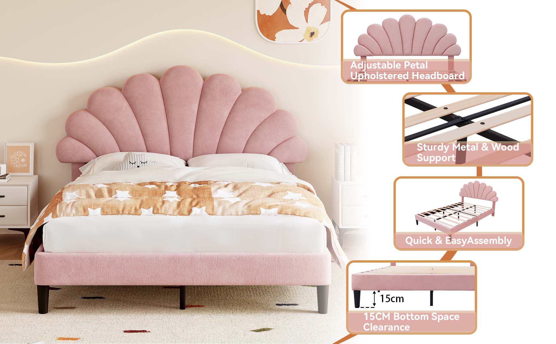 Product Name:4ft6 Double Upholstered Velvet Bed Frame, with Adjustable Chic Petal Headboard, Velvet Platform Bed Frame with Solid Wood Slat, No Box Spring Needed, Easy Assembly, Pink