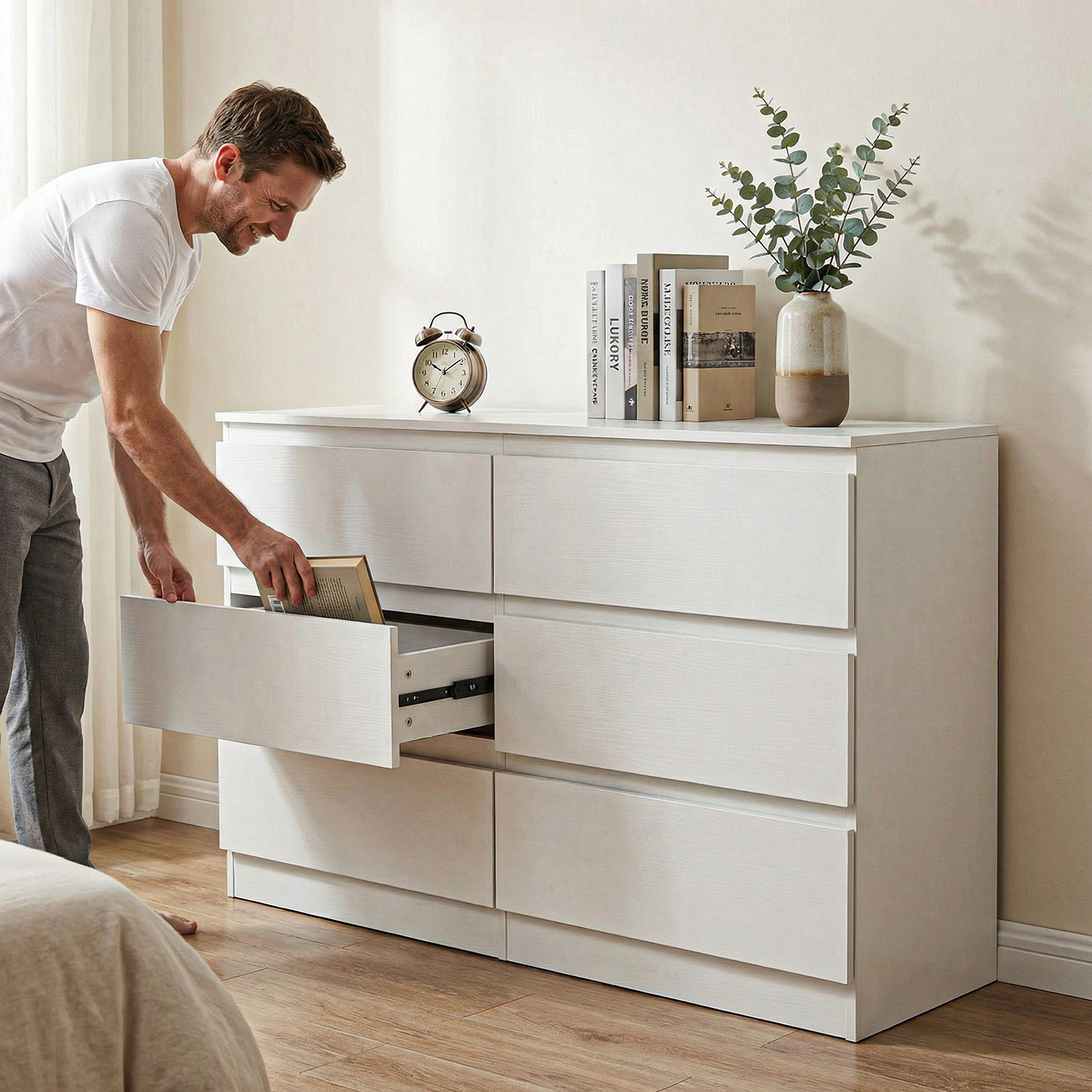Product Name:6 Drawer White Dresser, Modern Dresser for Bedroom with Spacious Countertop, Wood Storage Cabinet with Concealed Handles & 6 Deep Drawers for Bedroom, Living Room, Entryway, 15.7" D x 47.2" W x 30.9"