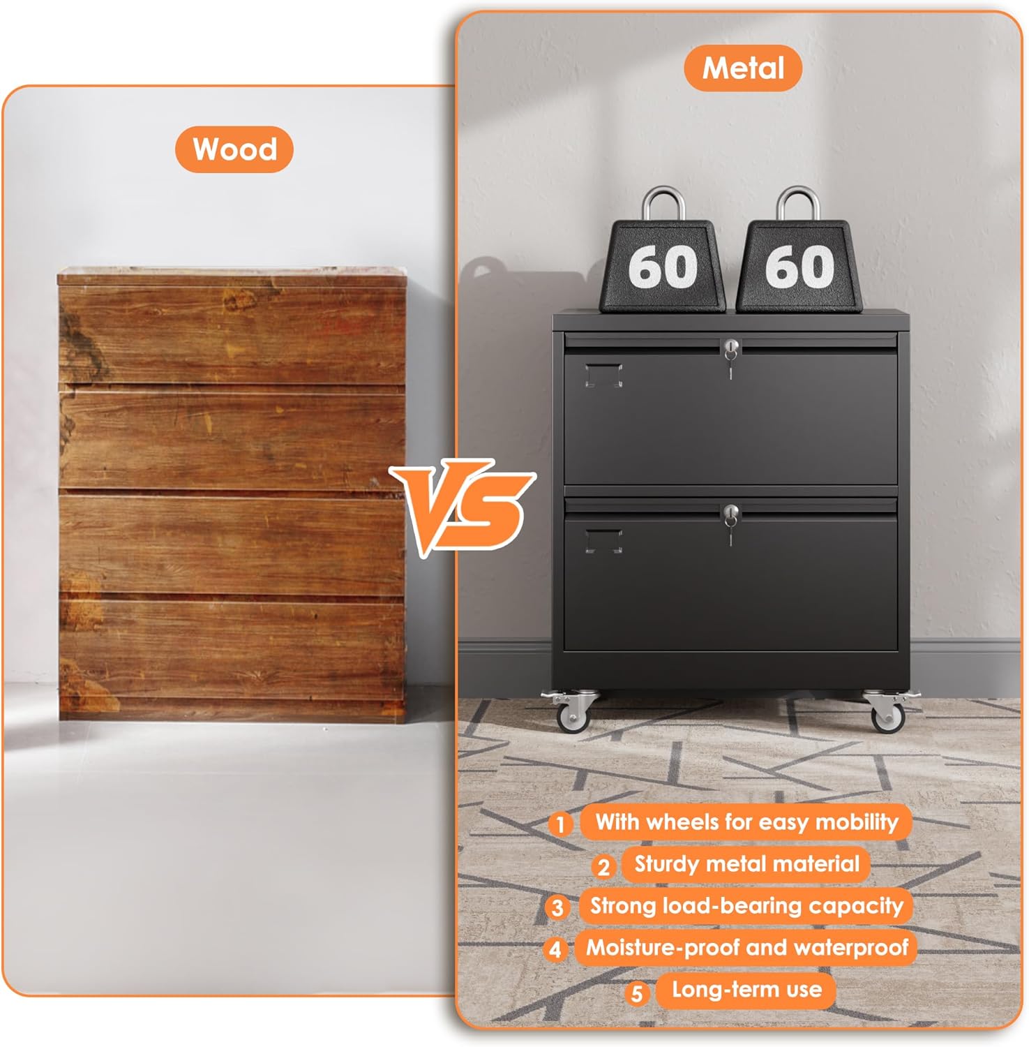 【High Quality Construction】The file cabinet with wheels is made of heavy duty steel material, and the surface with powder coating is very smooth, which can avoid rust. Due to their metal surface, metal storage cabinets are easy to clean and maintain.The wheels can be locked, placed fixedly or moved freely