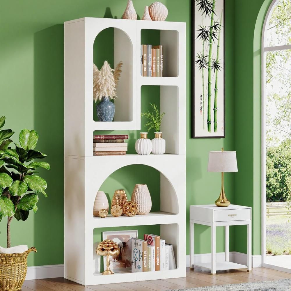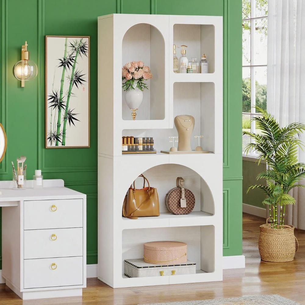 Unique Artistic Design: Showcasing a striking geometric silhouette, this modern elegant arched bookshelf has 5 irregular storage shelves with different heights and widths that provide a place for prized possessions of all sizes. Show off framed photos, potted plants, vases and artful decorations in statement-making style with this bookcase.