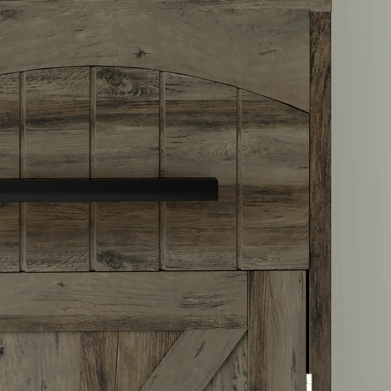 • - Farmhouse style with barn door and recessed drawer enhances decor
