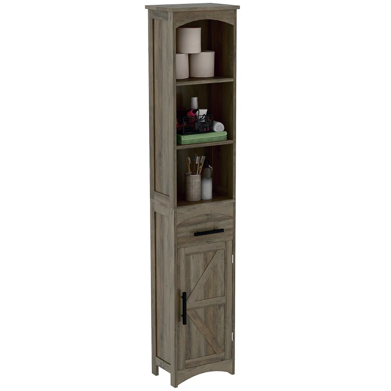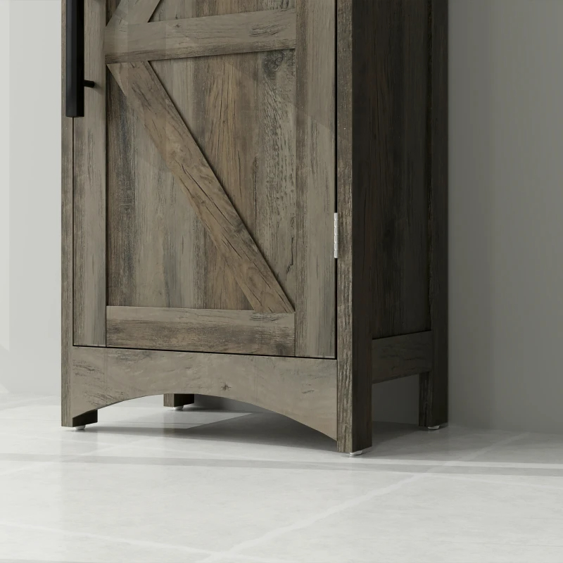 Farmhouse Tall Slim Bathroom Storage Cabinet With Recessed Drawer, Narrow Cabinet With Barn Door, Weathered Gray Oak