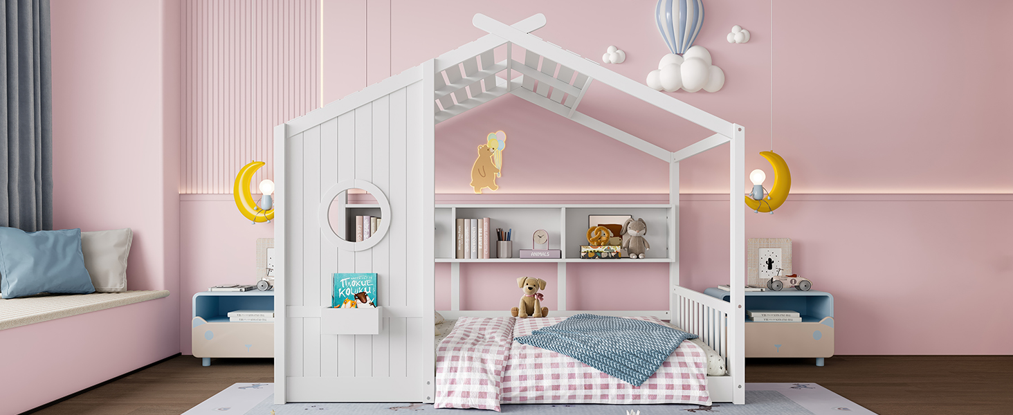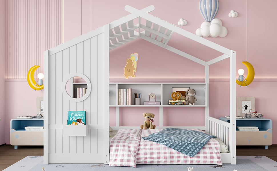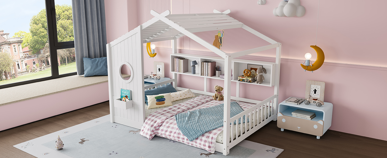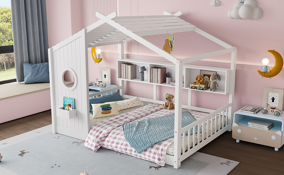 Product Name:Full Size Floor House Bed for Toddler, Kids Montessori Bed with Storage Shelf, Playhouse Bed with Roof Design, White