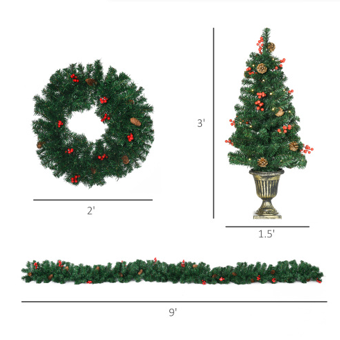 Product Name:HOMCOM Prelit Holiday Christmas 4-Piece Set, Garland Wreath and Set of 2 Entrance Trees with Warm White LED Lights, Red Berries, Pine Cones, Green