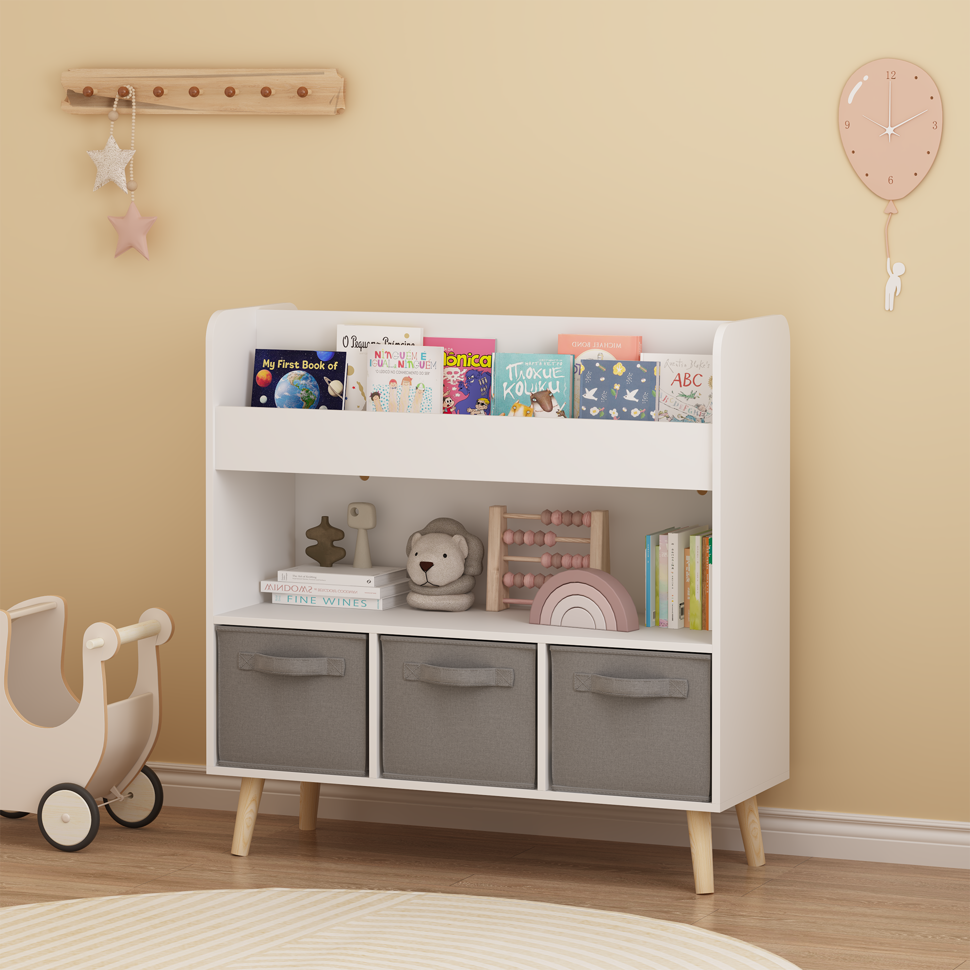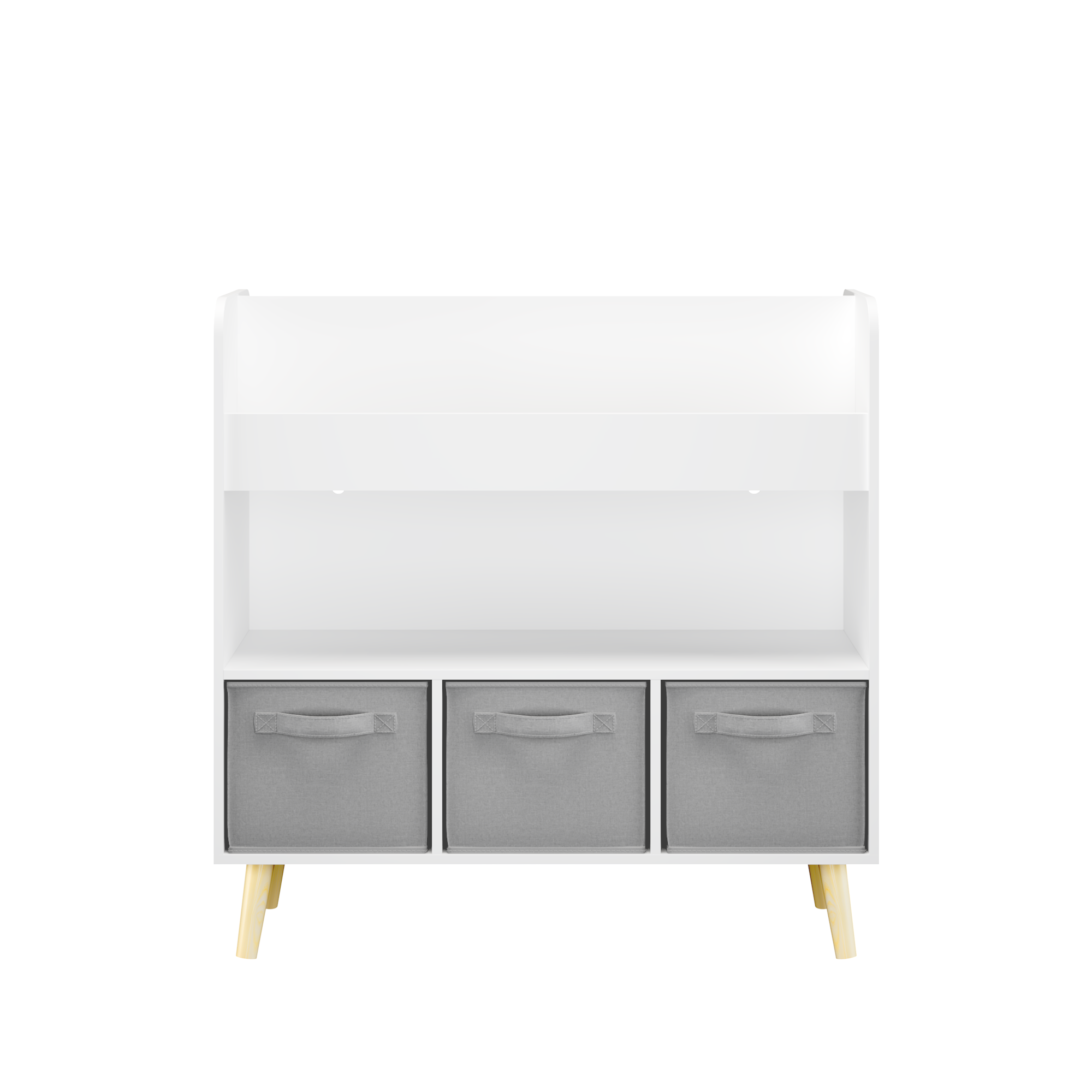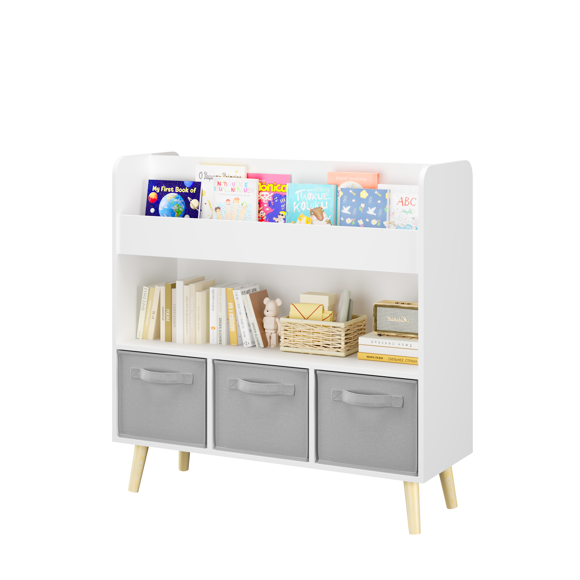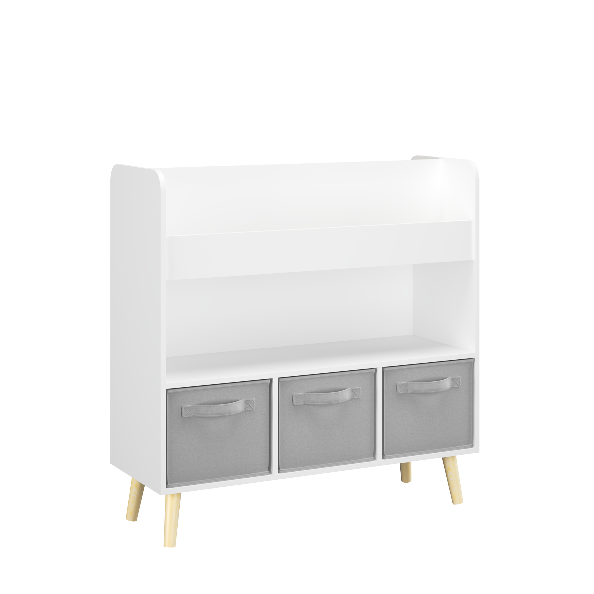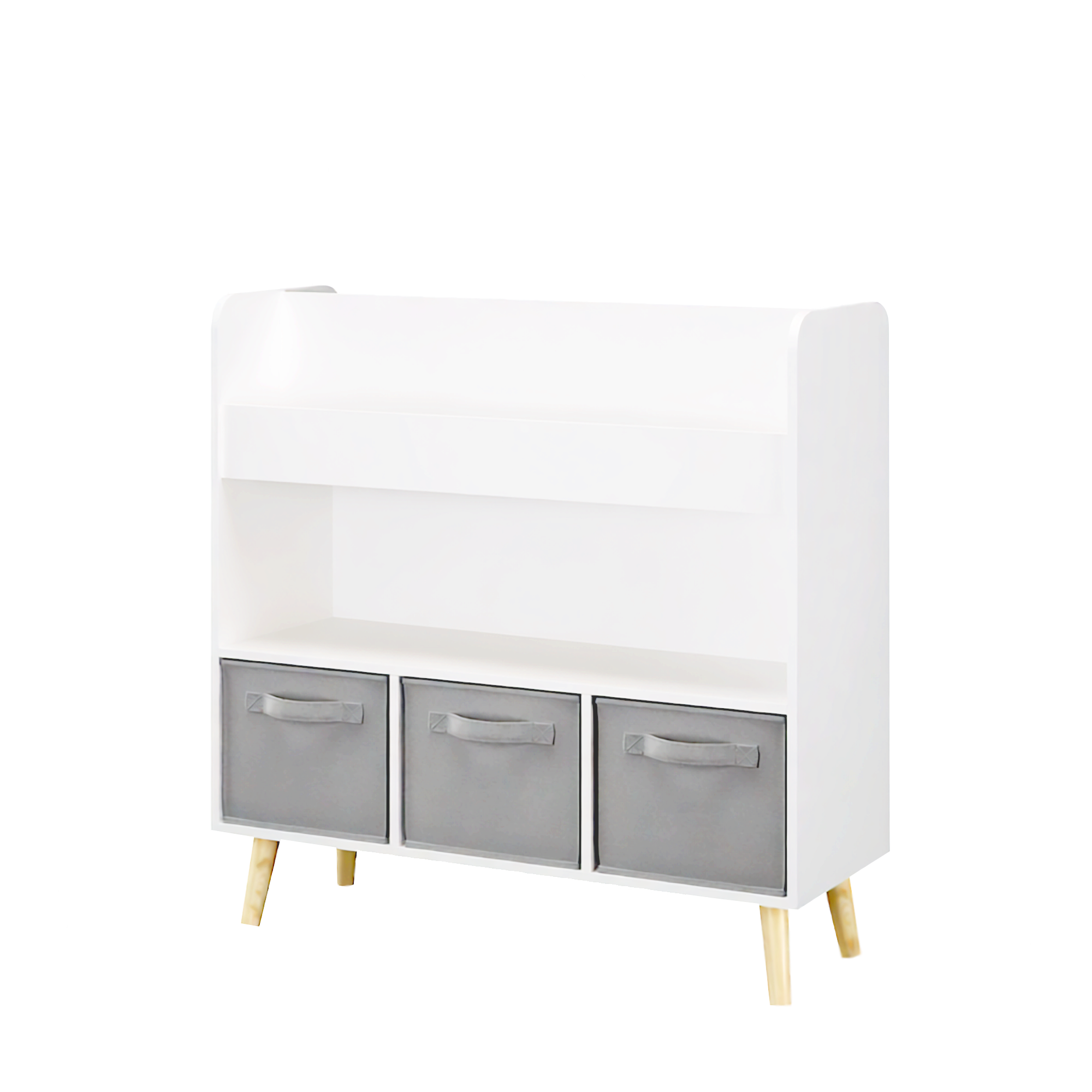 Product Name:Kids Bookshelf with 3 Fabric Bins, Modern Children's Bookcase with Storage for Toys and Books, Toddler Book Organizer Shelf for Playroom, Bedroom, or Nursery, White and Gray