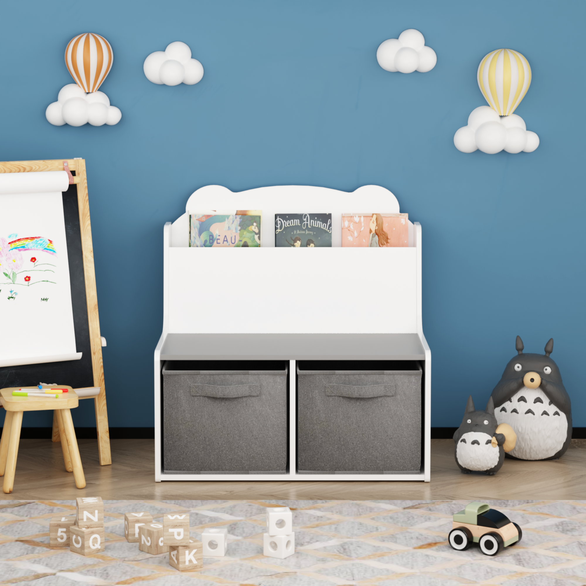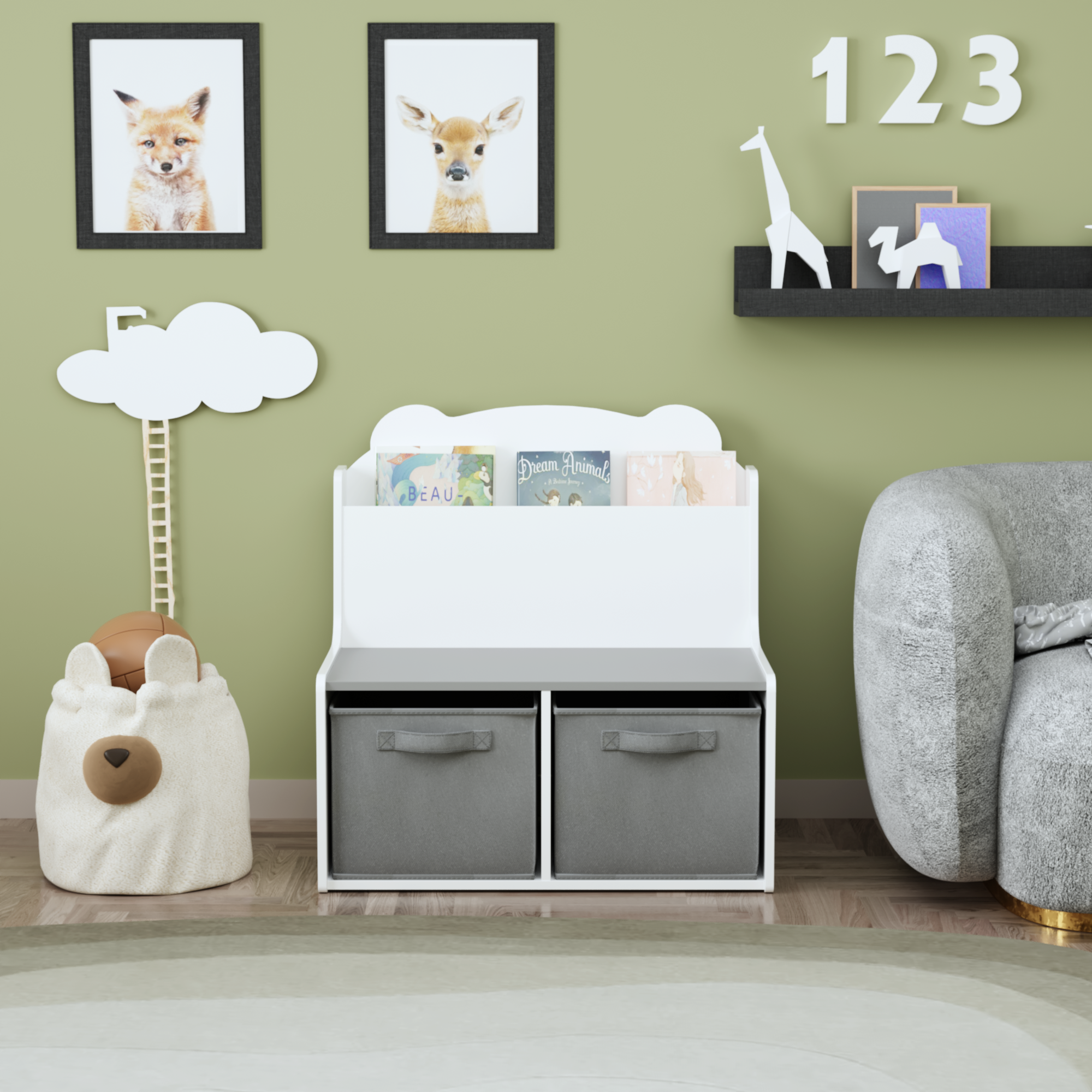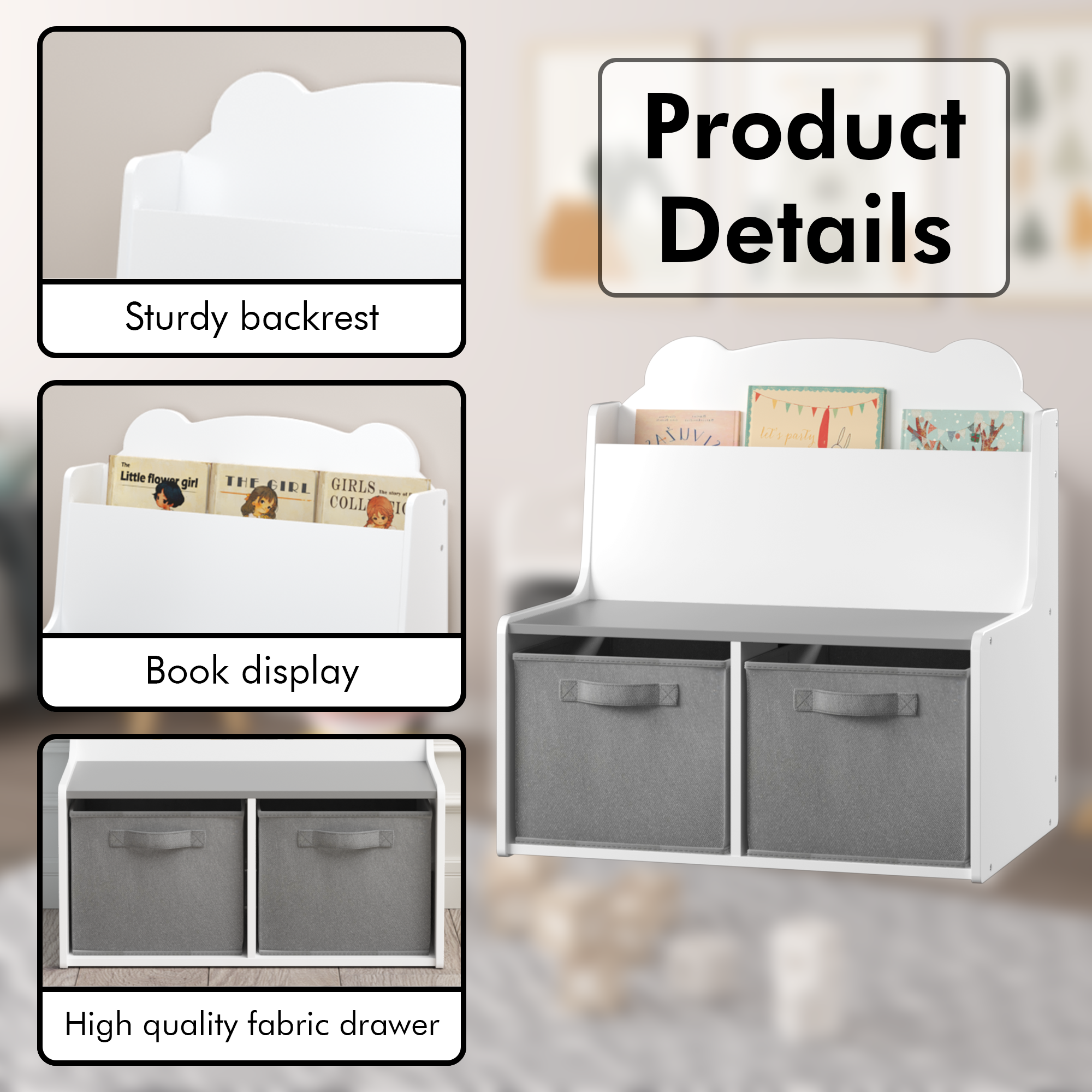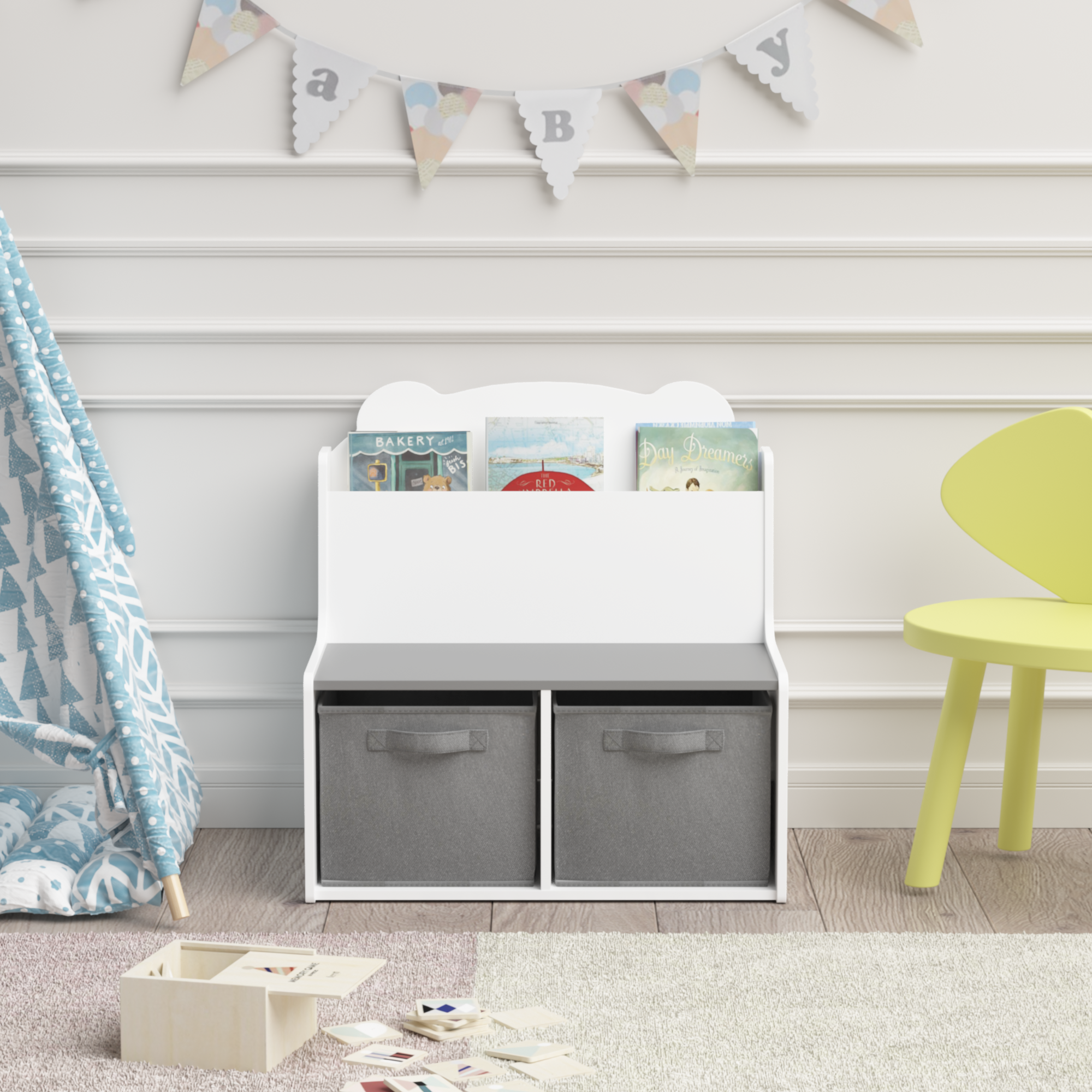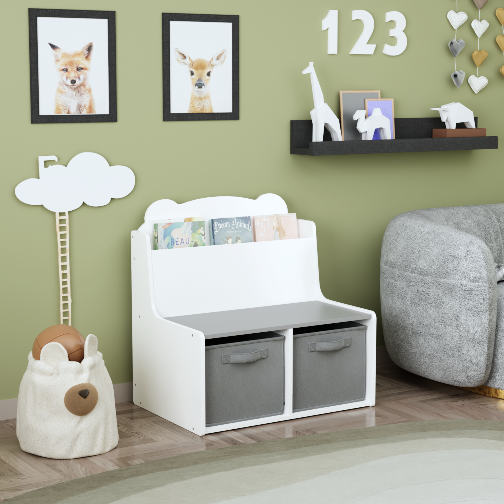 Product Name:Kids Bookshelf with Storage Bins – Wooden Bookcase with Book Display Shelf and 2 Fabric Bins, Cute Bear-Shaped Backboard, Toy Organizer for Toddlers and Children, White and Gray