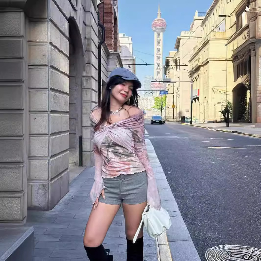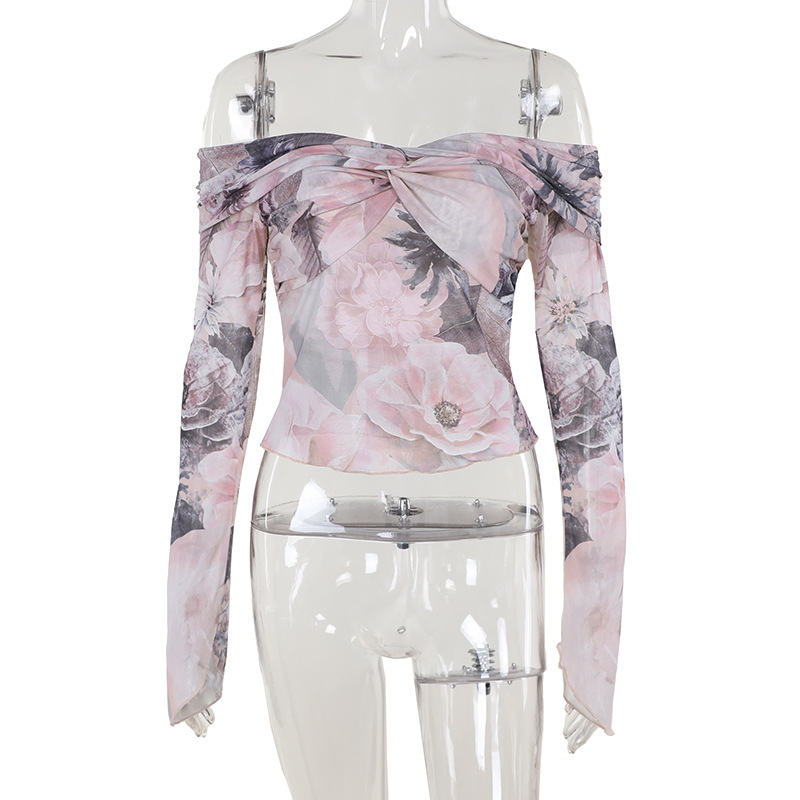 Mesh Floral Print Twist Fashion Summer New Personality Long Sleeve Bottoming Top
