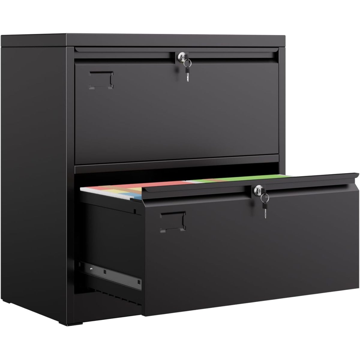 Metal 2 Drawer Lateral File Cabinet With 2 Lock - Wide Filing Cabinet For Letter Legal Hanging Files - Includes Business Card Holder,Home Office School Storage,Black