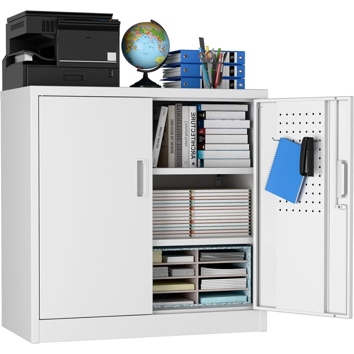 Metal Storage Cabinet With Pegboard 31.5'' X 31.5'' X 16.5'',Lockable Rolling Steel Storage Cabinet With 5 Adjustable Shelves And Door For Garage, Office, Kitchen, Assembly Required White