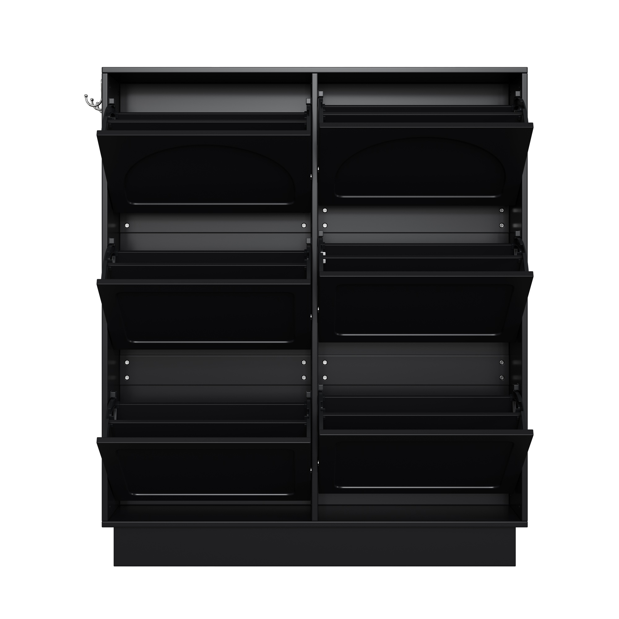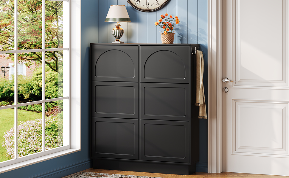 Product Name:Modern Elegant Narrow Tipping Bucket Shoe Cabinet with 6 Flip Drawers, Space Saving Design, Cream Style Entryway Organizer with Adjustable Shelf, Free-Standing Shoe Rack with 3 Silvery Hooks, Black
