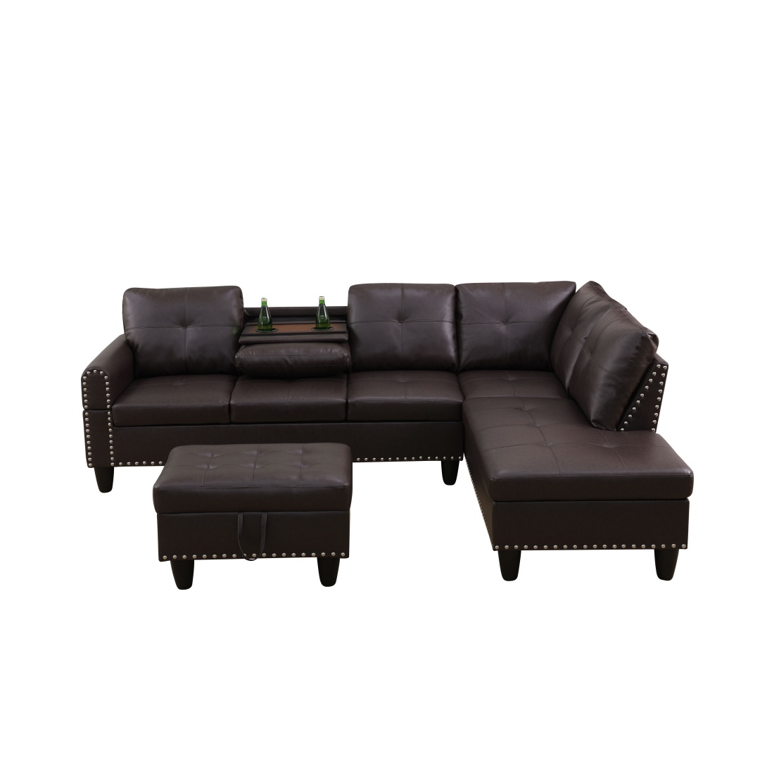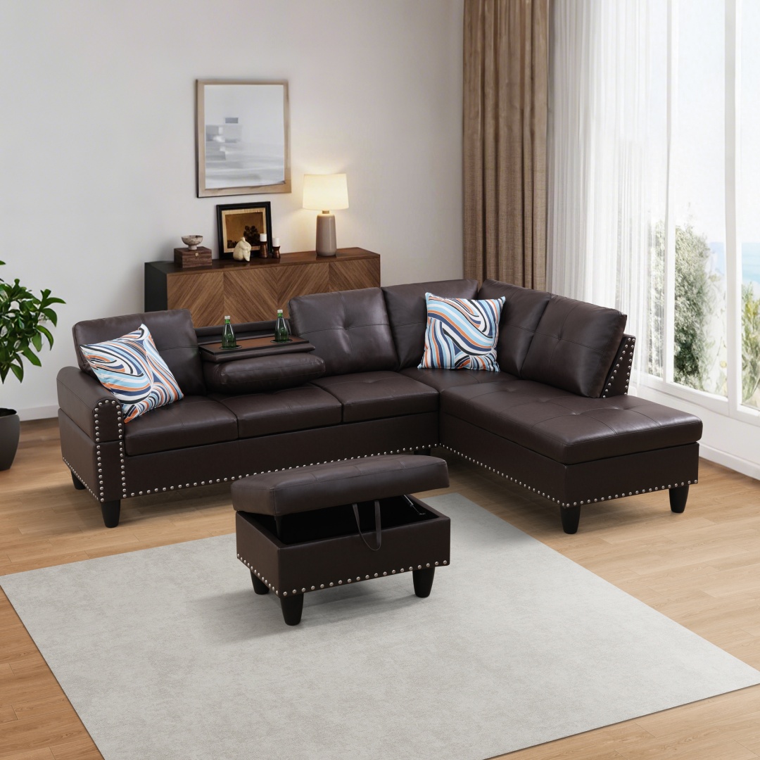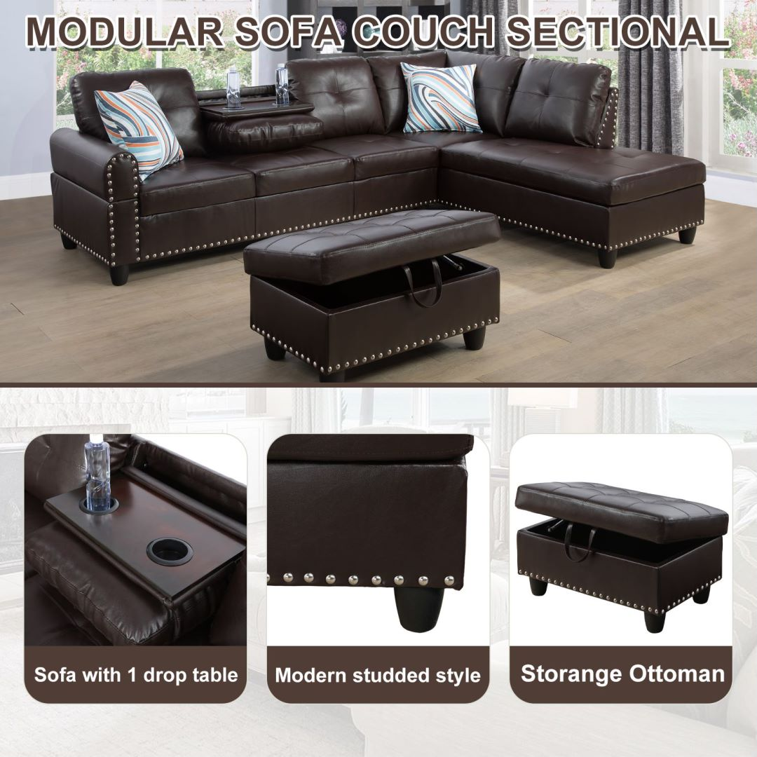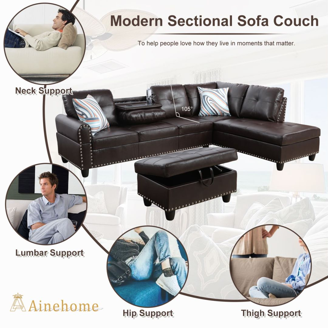 | CHARACTERISTIC | a. The sofa (Brown) with decorative copper nails, made of nickel plating, with stronge sense of elegance. b. The ottoman with storage function, can store small items for daily use, which is flexible and convenient c. The middle of sofa with reversible coffee table, stretched been coffee table, closed been normal sofa; The cup-holder with drinks settlement function, which is convenient and flexible d. The sofa and chaise can be splited, free combination can meet the demand for usage in different situations |