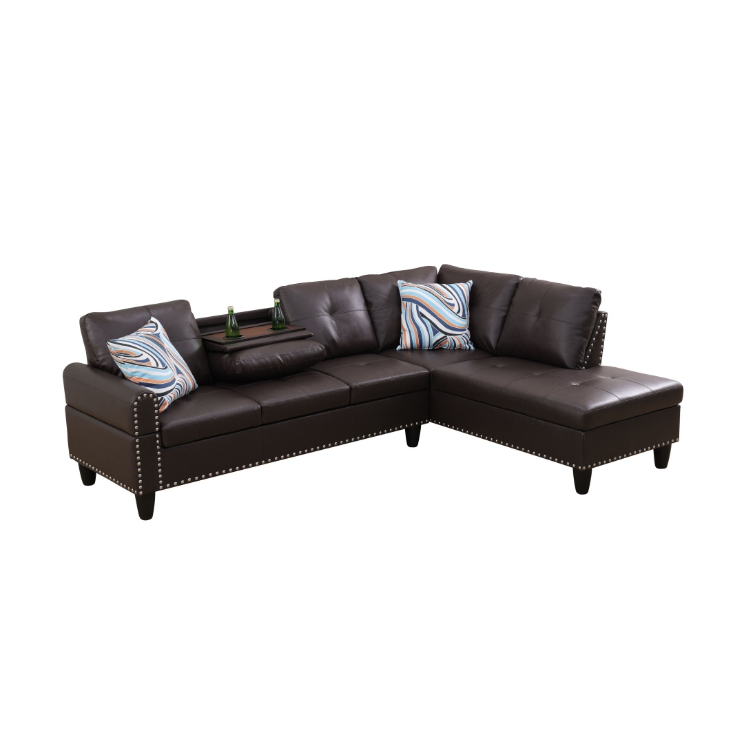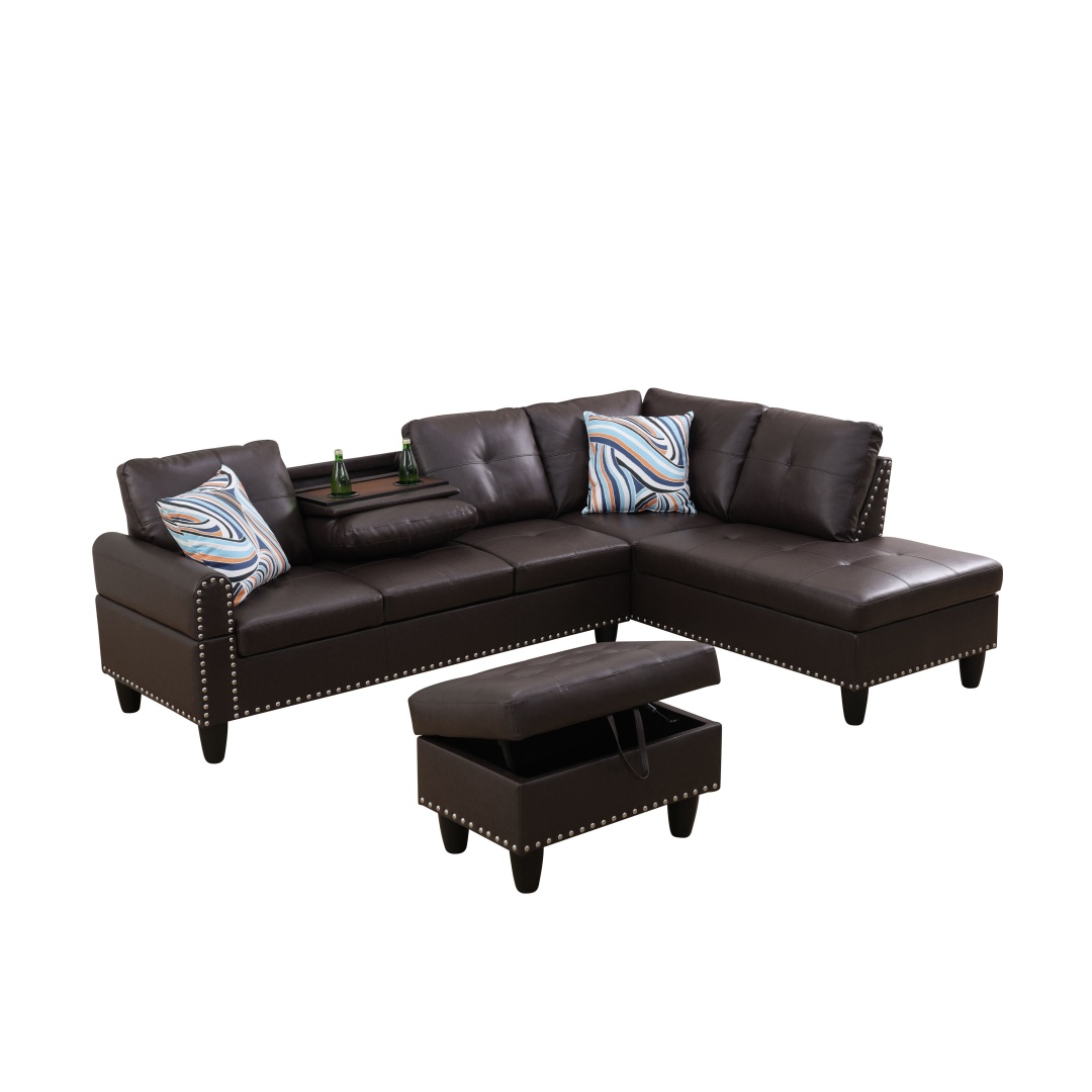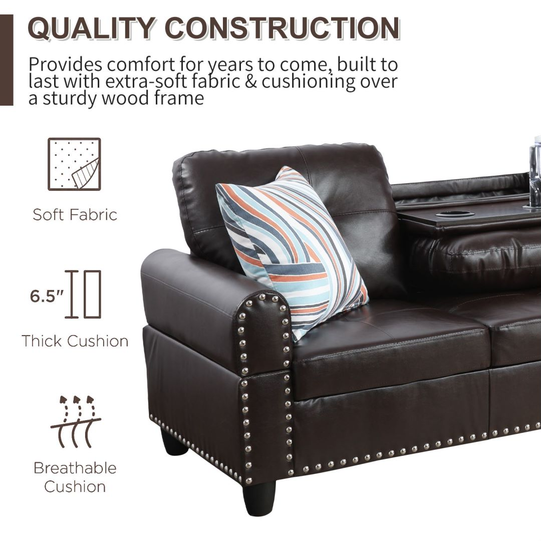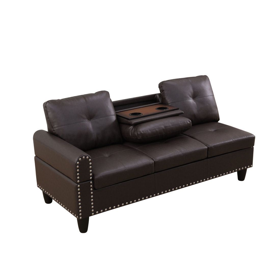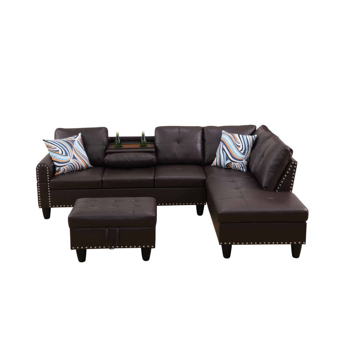 | CHARACTERISTIC | a. The sofa (Brown) with decorative copper nails, made of nickel plating, with stronge sense of elegance. b. The ottoman with storage function, can store small items for daily use, which is flexible and convenient c. The middle of sofa with reversible coffee table, stretched been coffee table, closed been normal sofa; The cup-holder with drinks settlement function, which is convenient and flexible d. The sofa and chaise can be splited, free combination can meet the demand for usage in different situations |