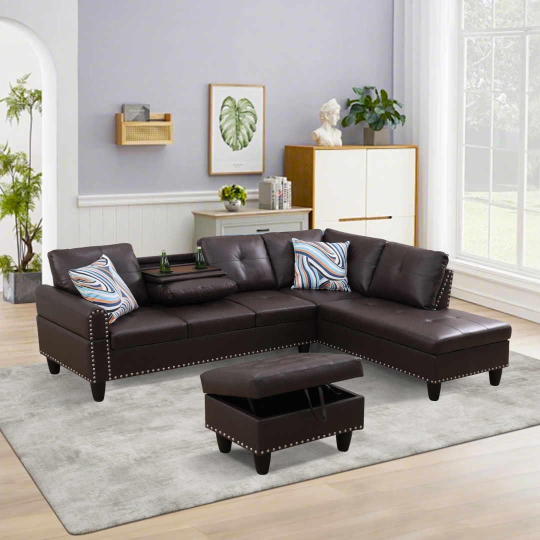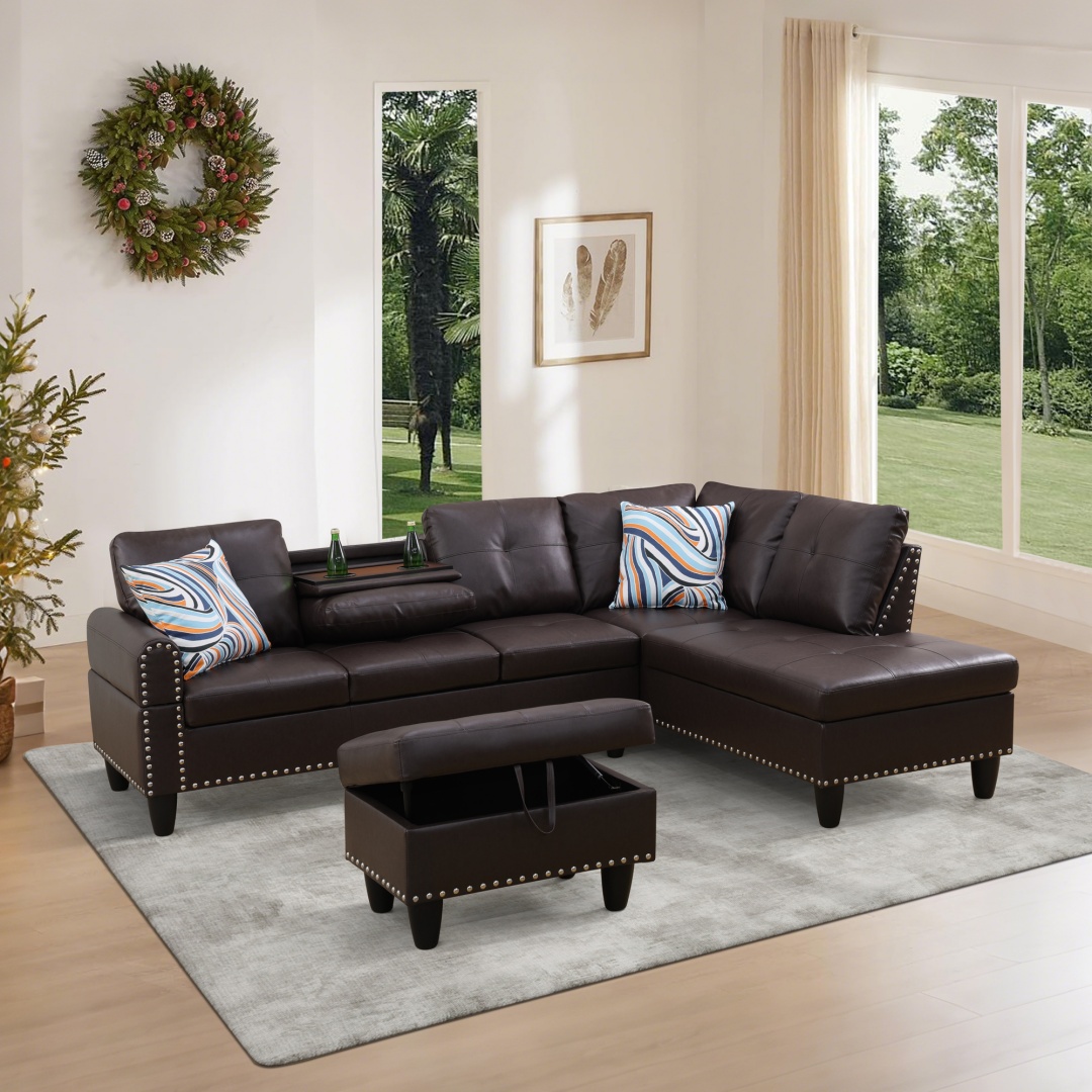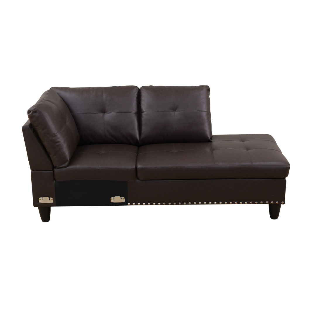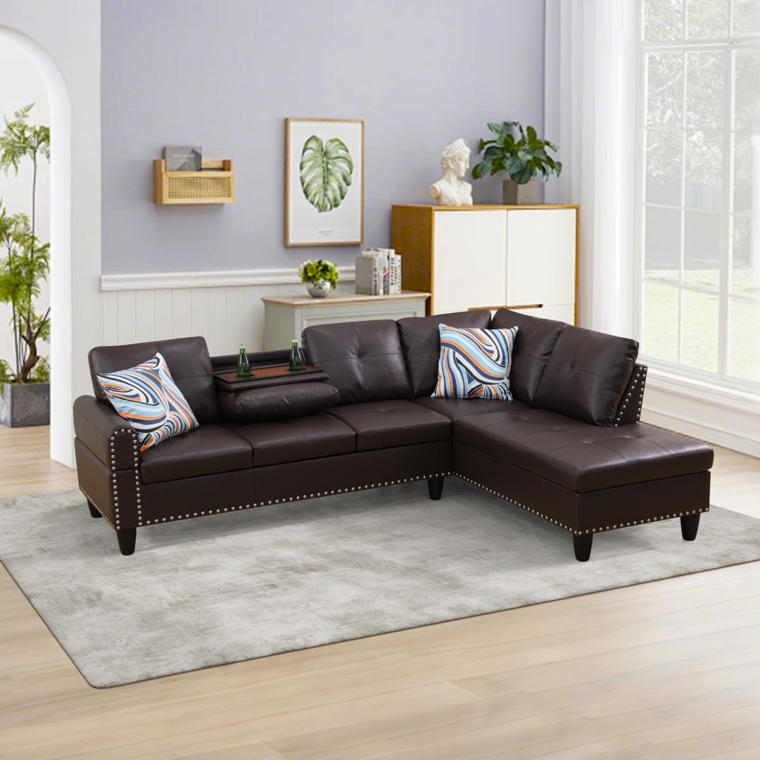 | CHARACTERISTIC | a. The sofa (Brown) with decorative copper nails, made of nickel plating, with stronge sense of elegance. b. The ottoman with storage function, can store small items for daily use, which is flexible and convenient c. The middle of sofa with reversible coffee table, stretched been coffee table, closed been normal sofa; The cup-holder with drinks settlement function, which is convenient and flexible d. The sofa and chaise can be splited, free combination can meet the demand for usage in different situations |