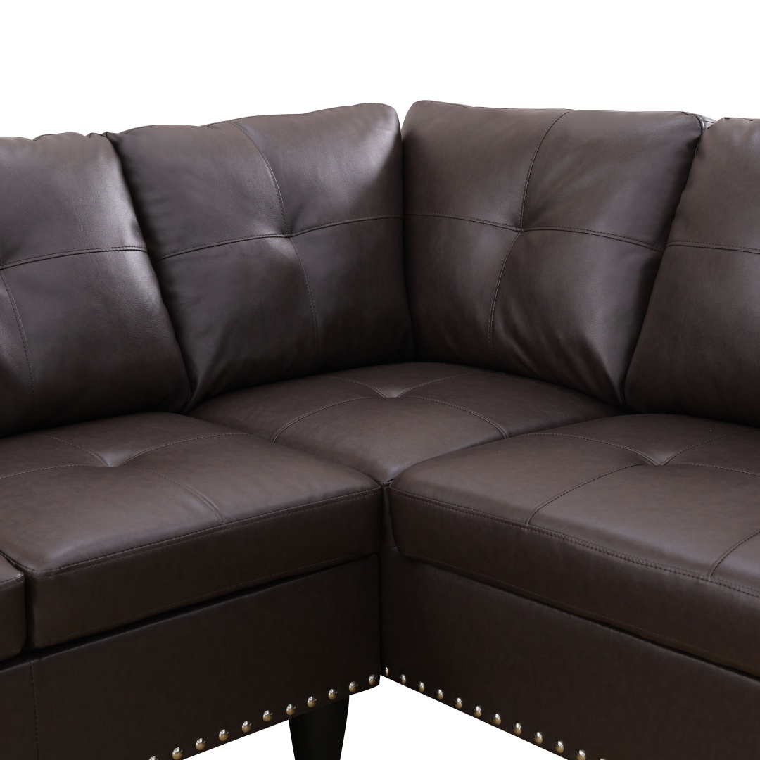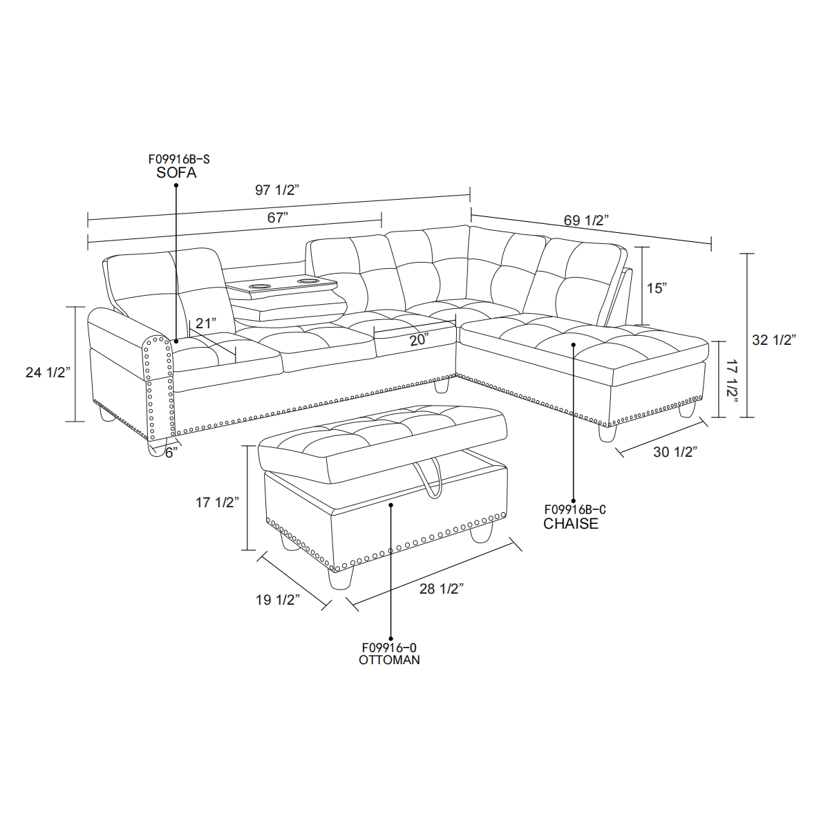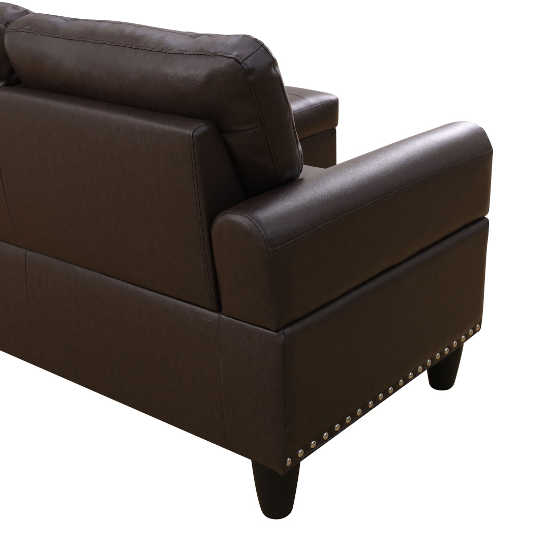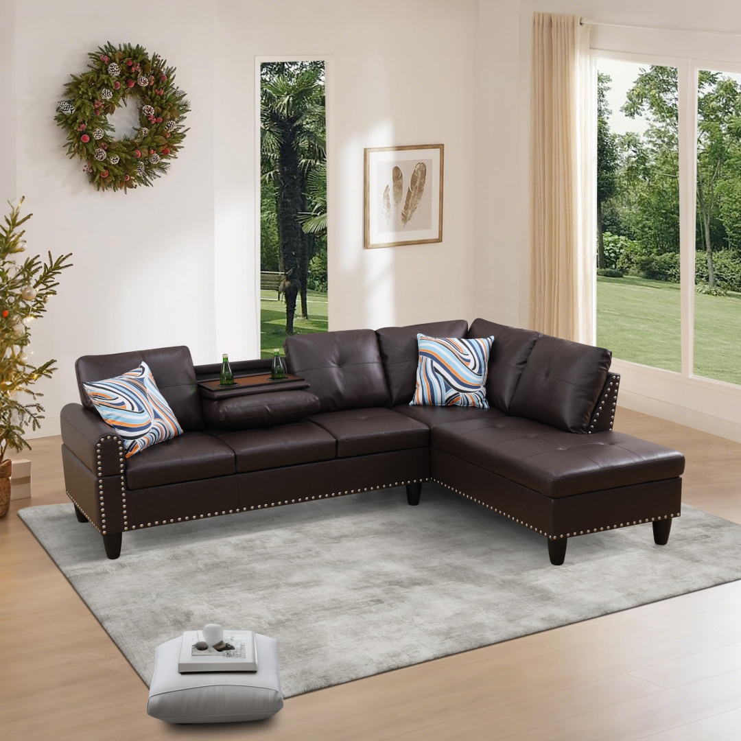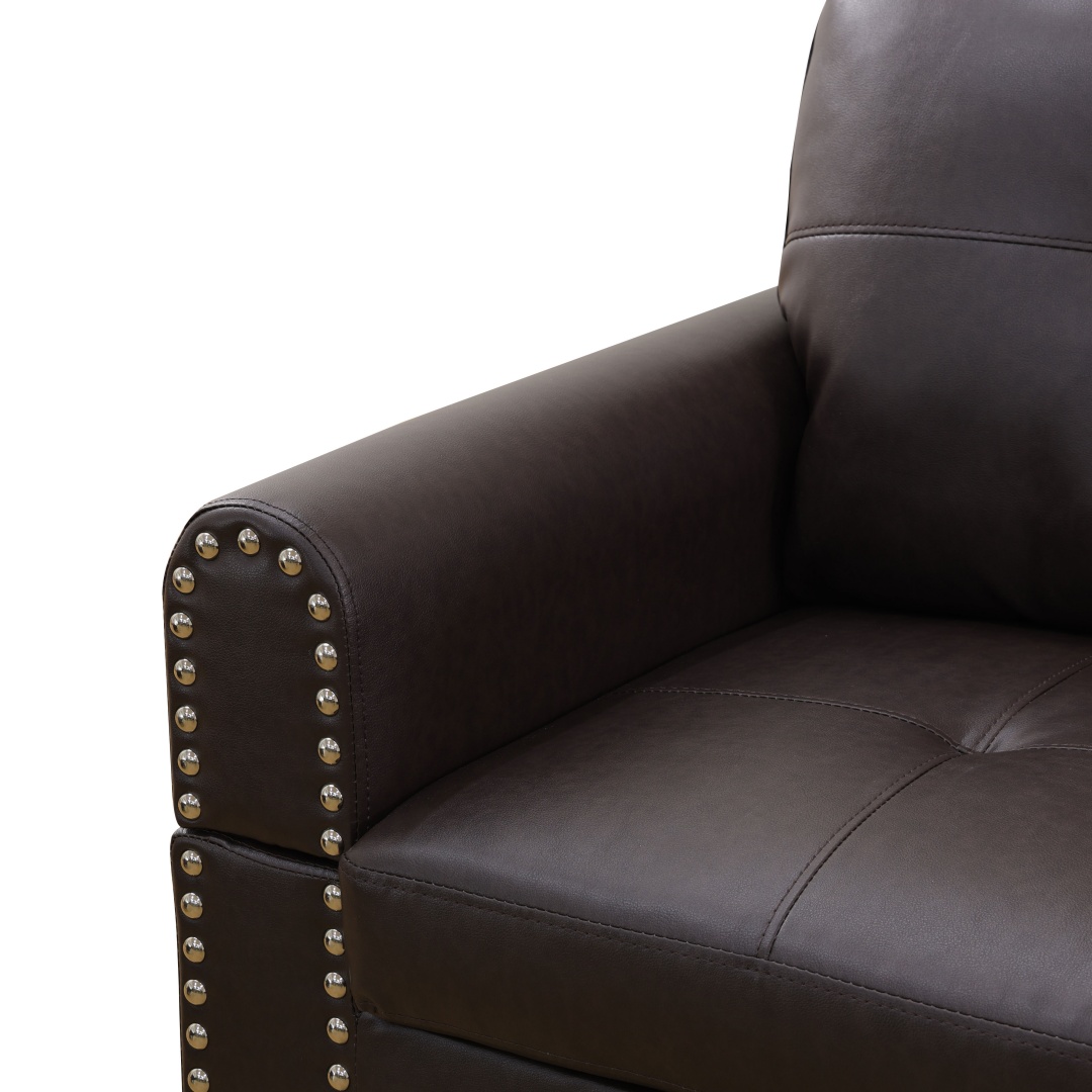| CHARACTERISTIC | a. The sofa (Brown) with decorative copper nails, made of nickel plating, with stronge sense of elegance. b. The ottoman with storage function, can store small items for daily use, which is flexible and convenient c. The middle of sofa with reversible coffee table, stretched been coffee table, closed been normal sofa; The cup-holder with drinks settlement function, which is convenient and flexible d. The sofa and chaise can be splited, free combination can meet the demand for usage in different situations |