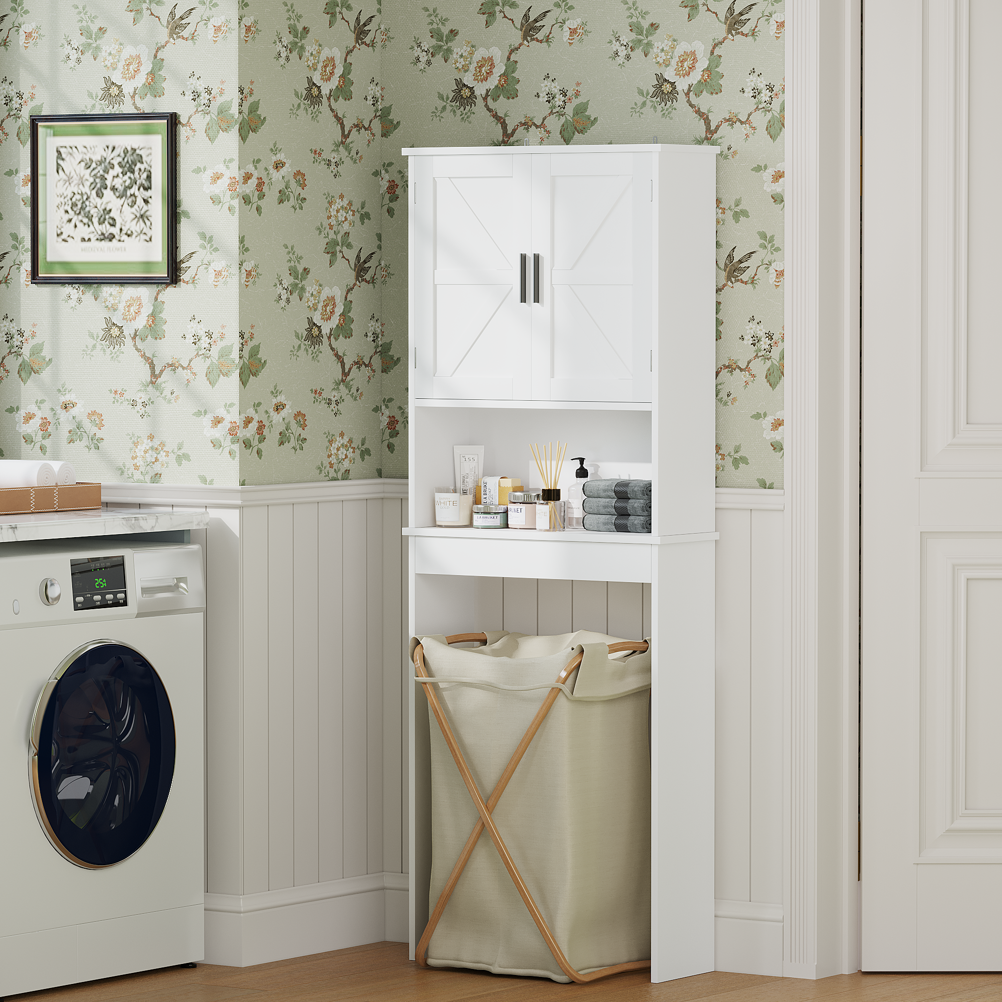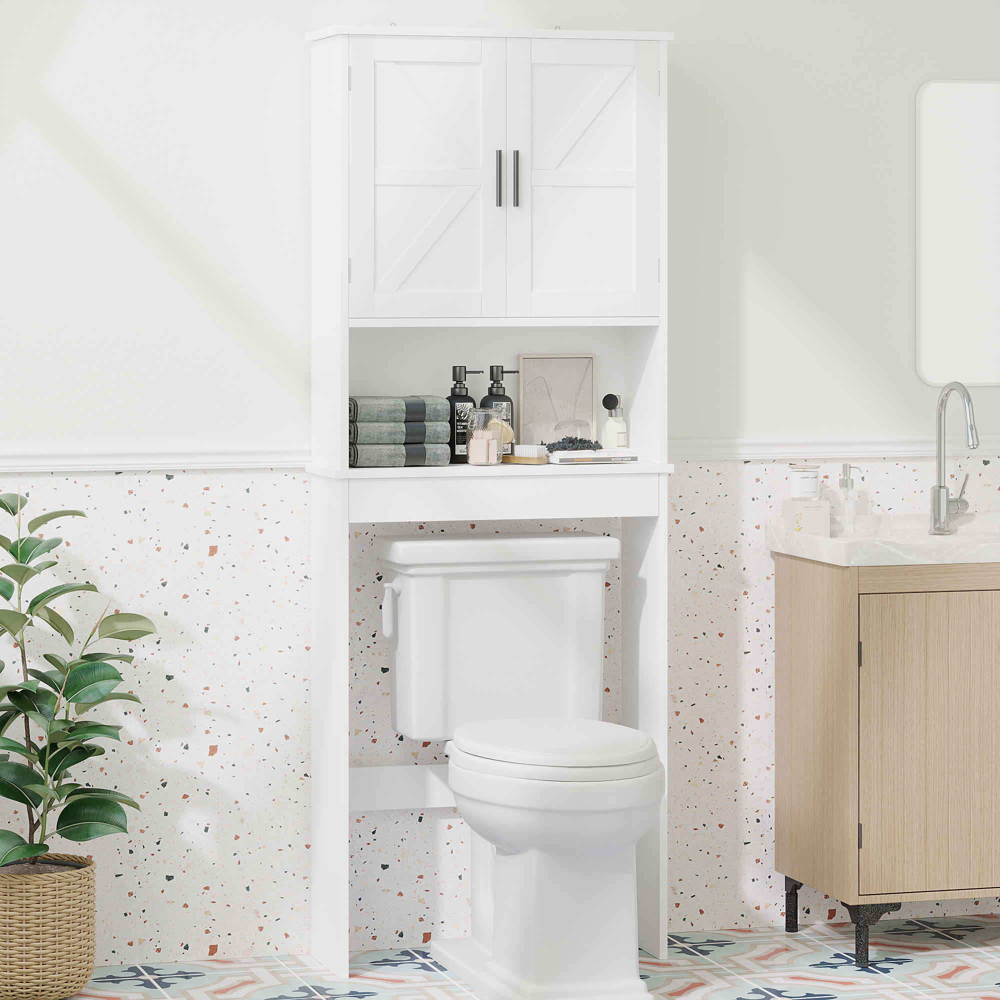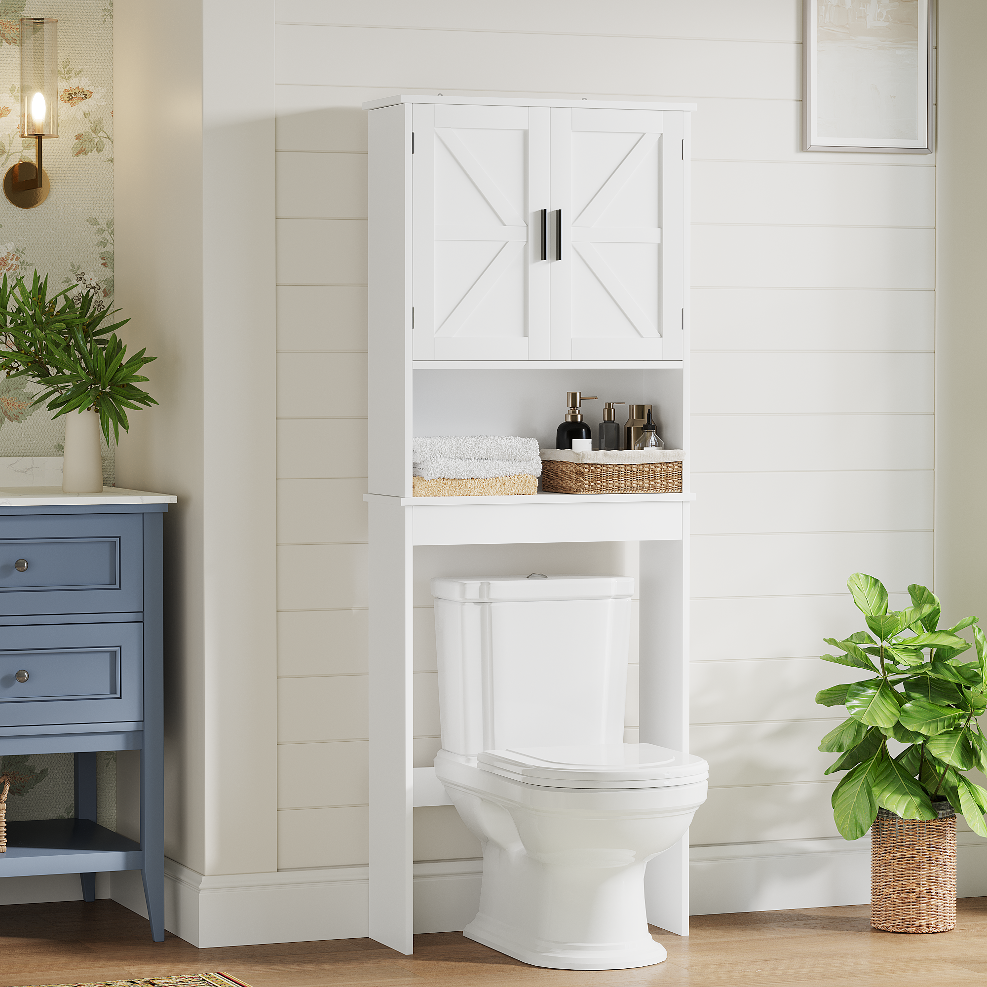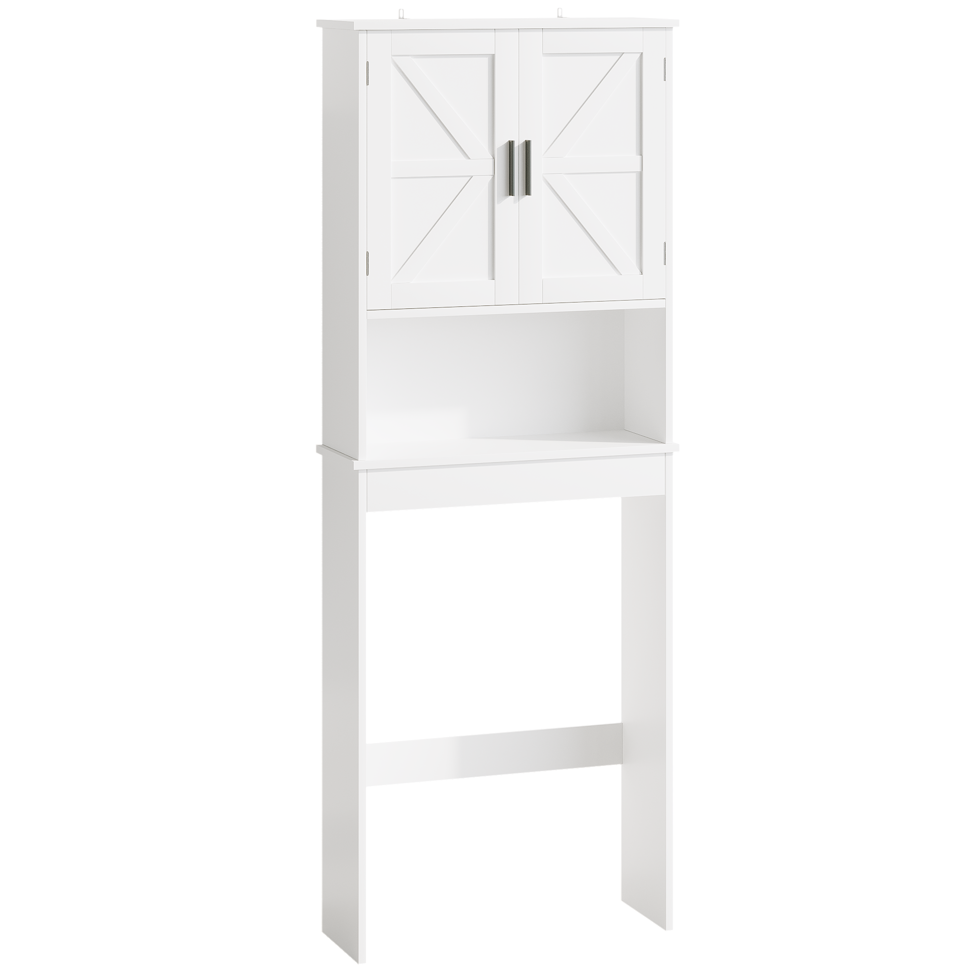 Product Name:Over The Toilet Storage Cabinet with Adjustable Shelf, Bathroom Space Saver Organizer with Double Doors and Open Shelf, Freestanding Toilet Rack for Small Bathroom – White