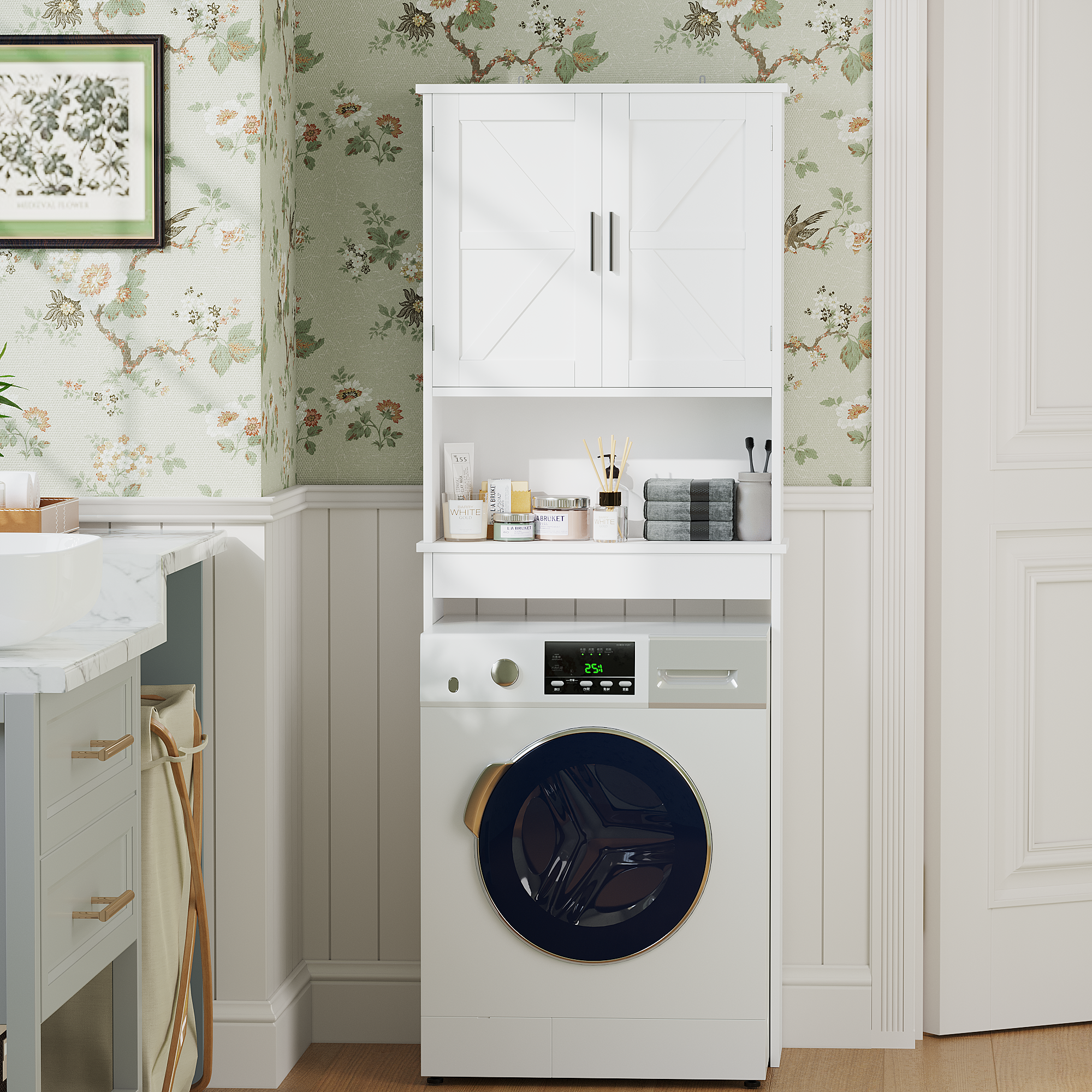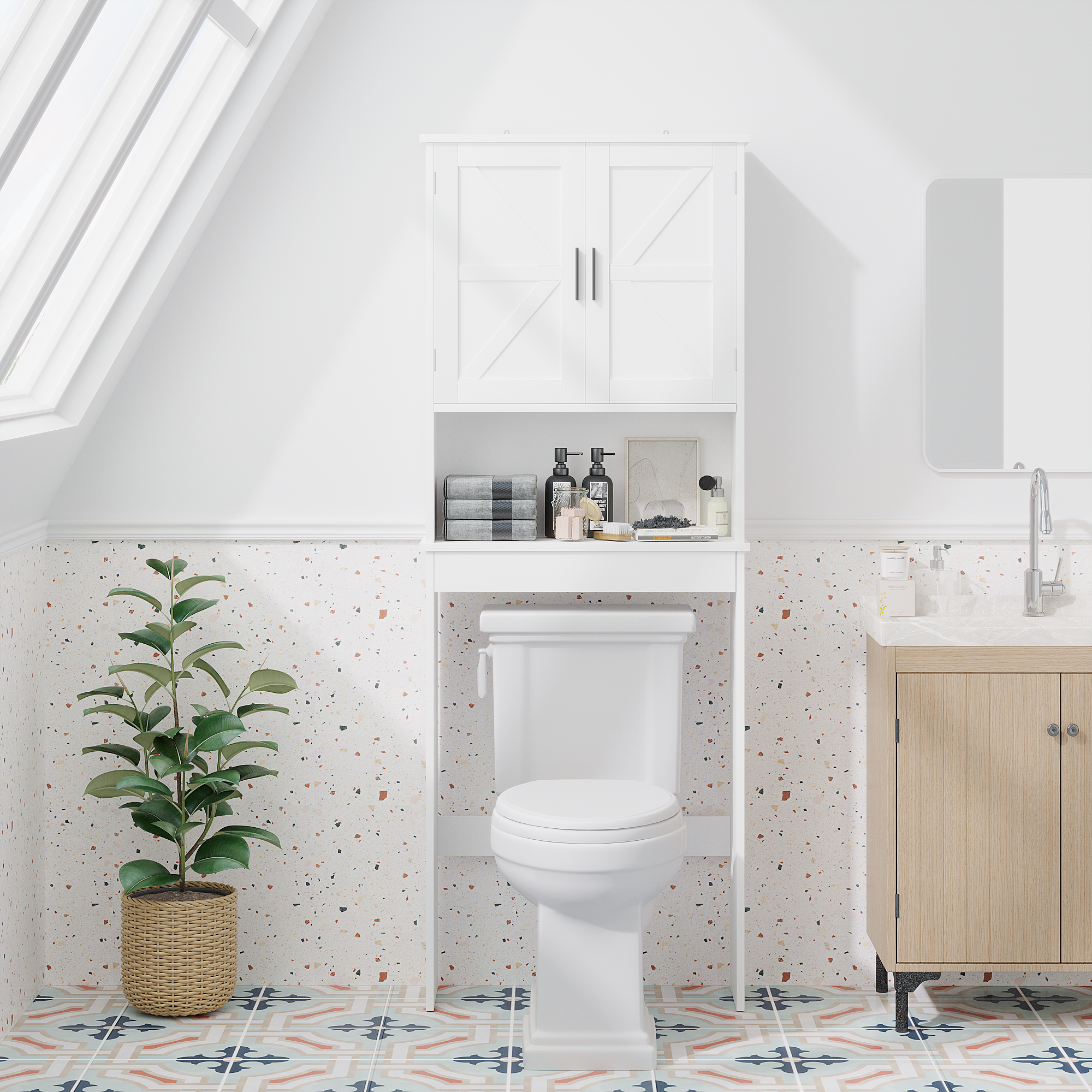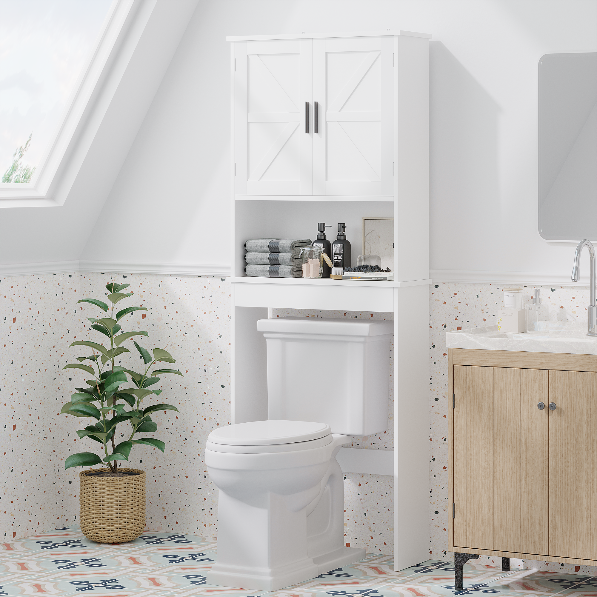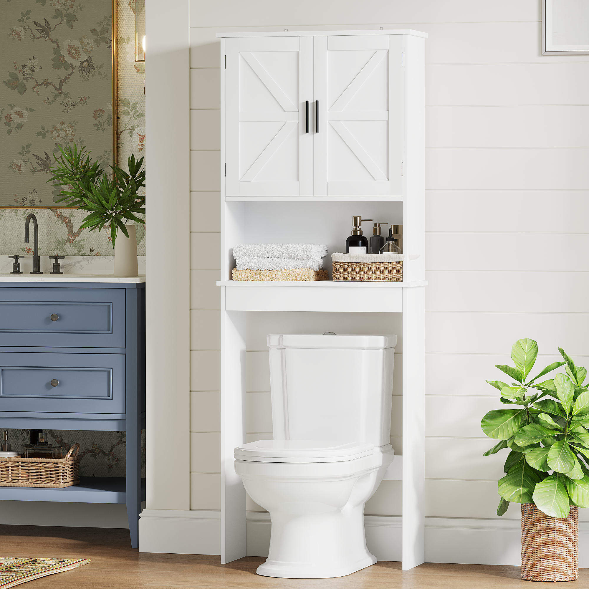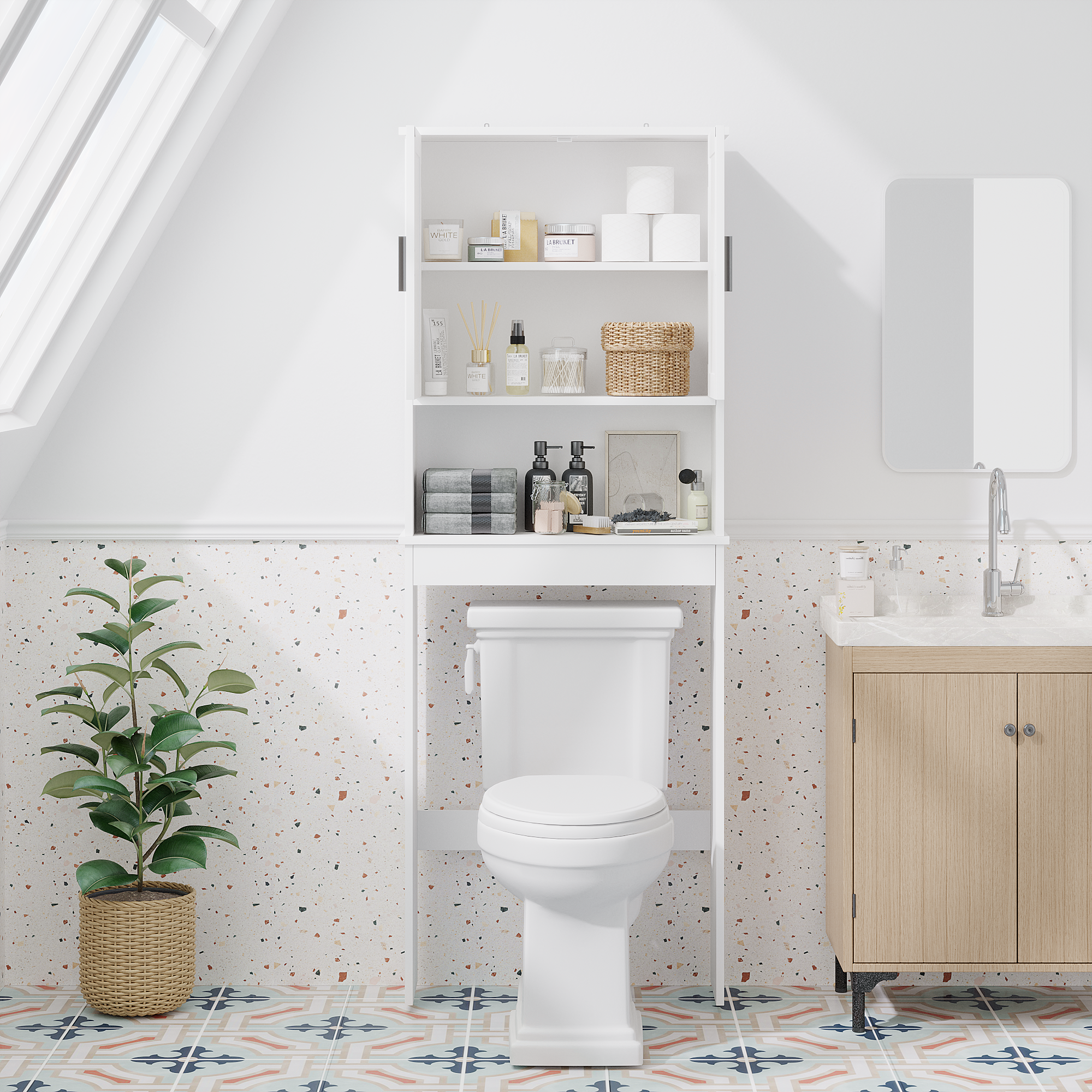 Product Name:Over The Toilet Storage Cabinet with Adjustable Shelf, Bathroom Space Saver Organizer with Double Doors and Open Shelf, Freestanding Toilet Rack for Small Bathroom – White