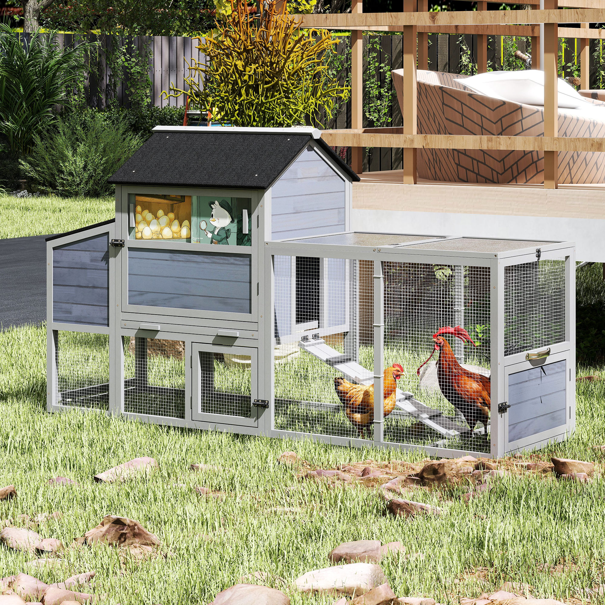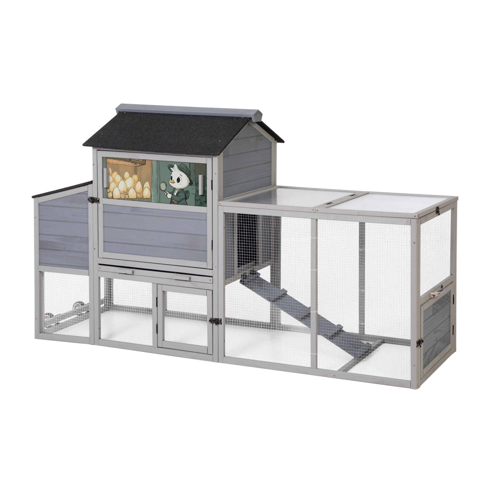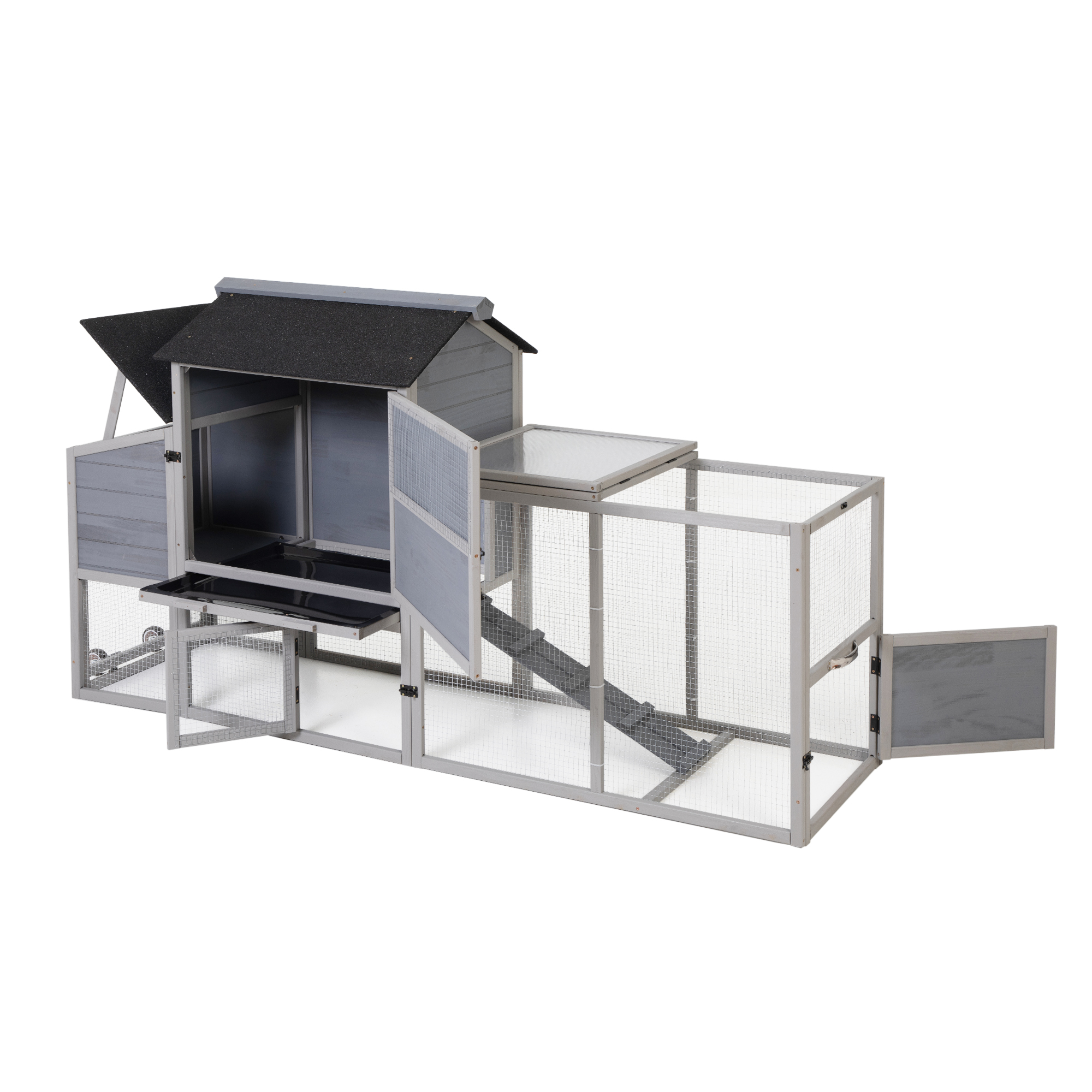 Color: Gray with Colorful Patterns Material: Pinewood + Galvanized Mesh + Asphalt + PC Sun Board Overall Dimensions: 82.28"L x 25.6"W x 44.88"H Nesting Box (with the bottom mesh): 22.83"L x 14.57"W x 30.31"H Main House with Sleeping Area: 31.02"L x 25.6"W x 44.88"H Large Run: 39.37"L x 21.85"W x 28.94"H Window of Sleeping Area: 11.42"L x 7.48"W Front Door of Sleeping Area: 25.8"L x 19.7"W Pull-Out Tray: 25.8"L x 21.26"W Openable Top of Run: 21.85"L x 19.3"W Side Wood Door: 16.93"L x 12.2"W Panel with Colorful Patterns: 24.02"L x 9.3"W Net Weight: 61.73 lbs