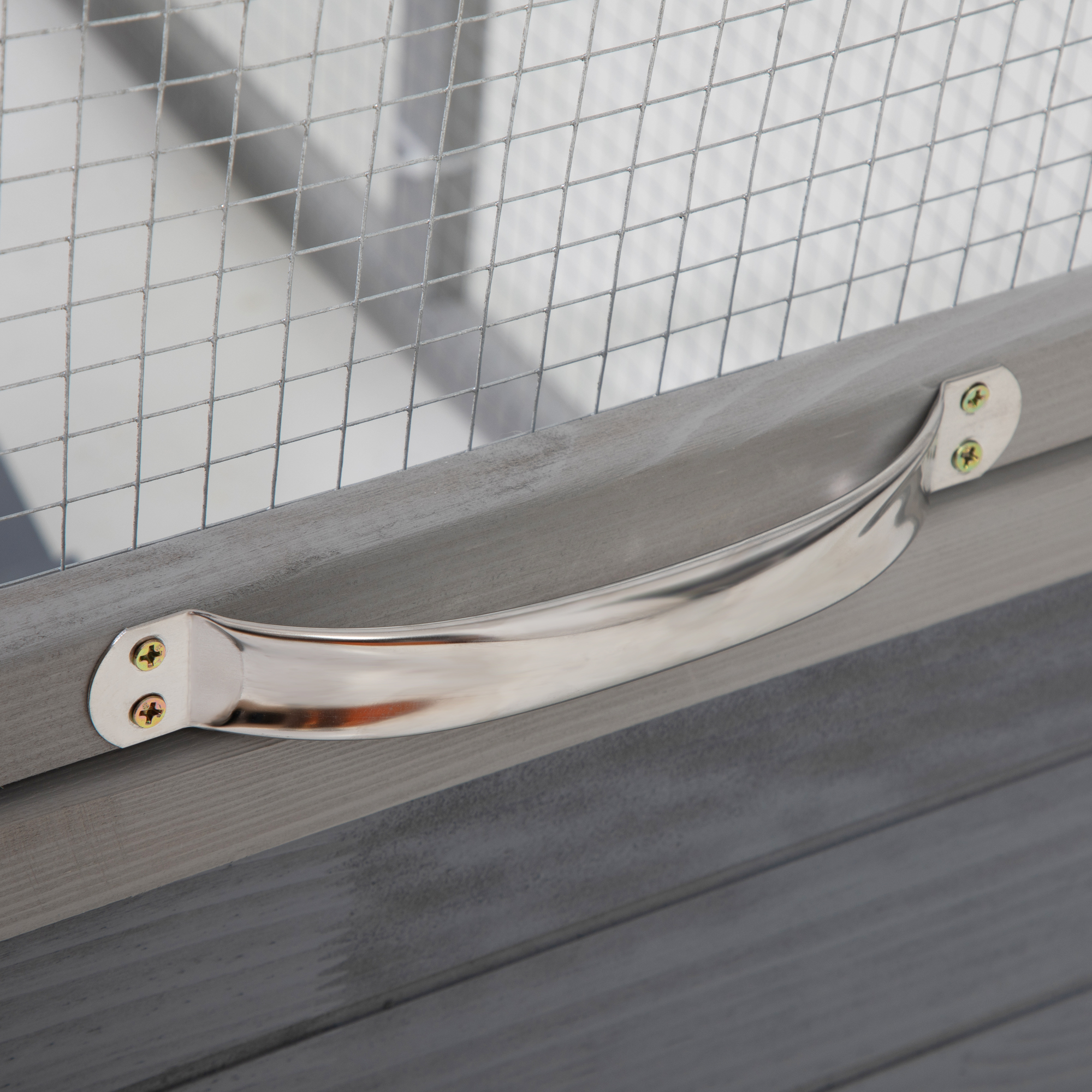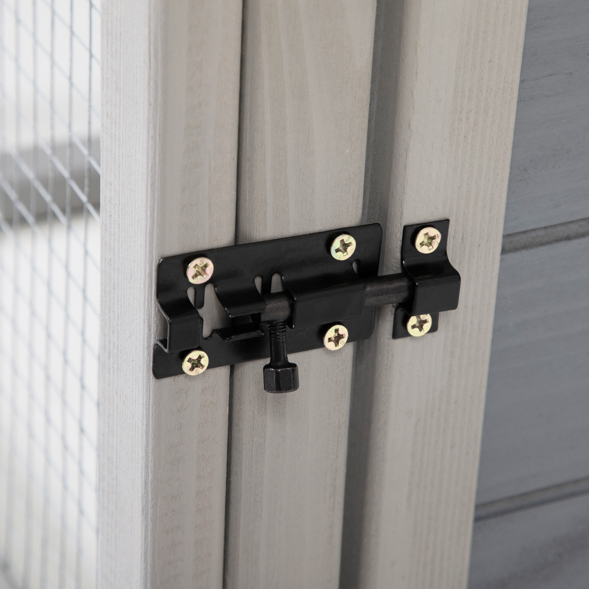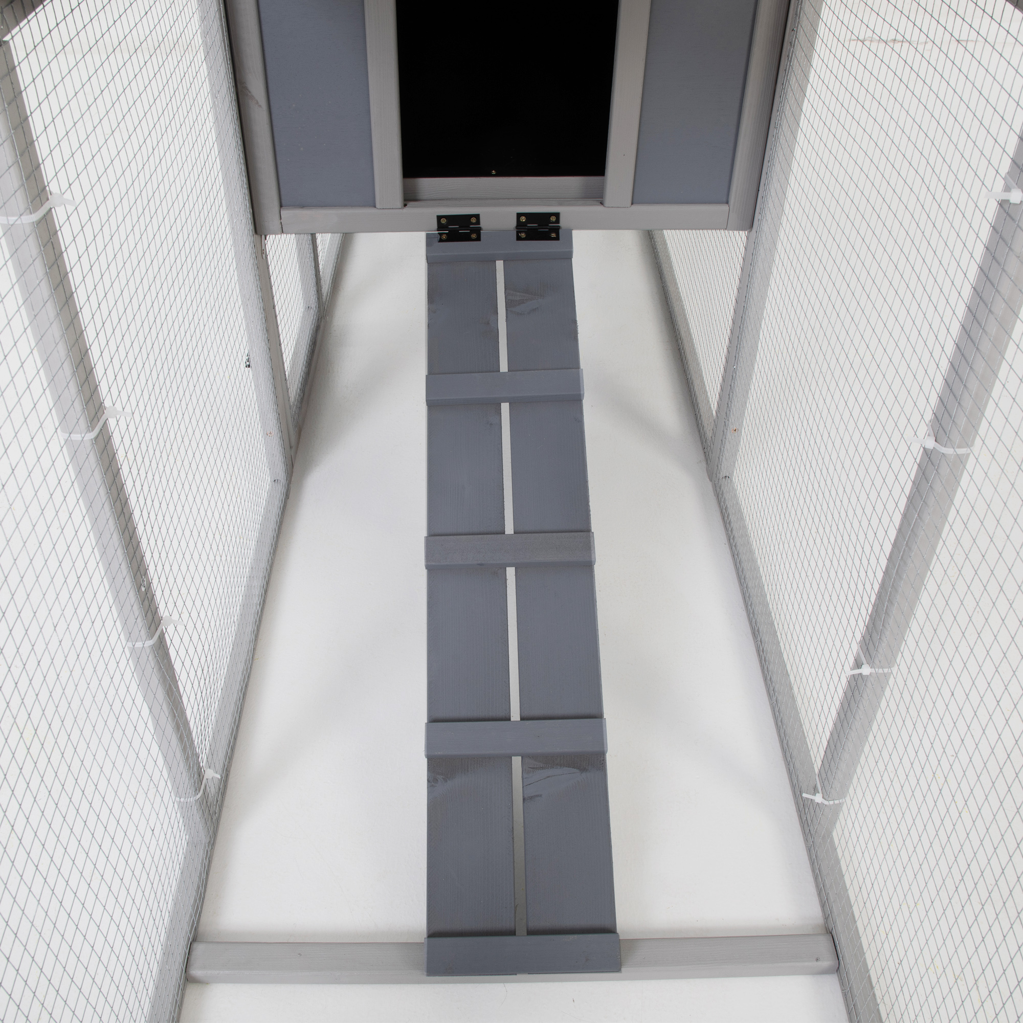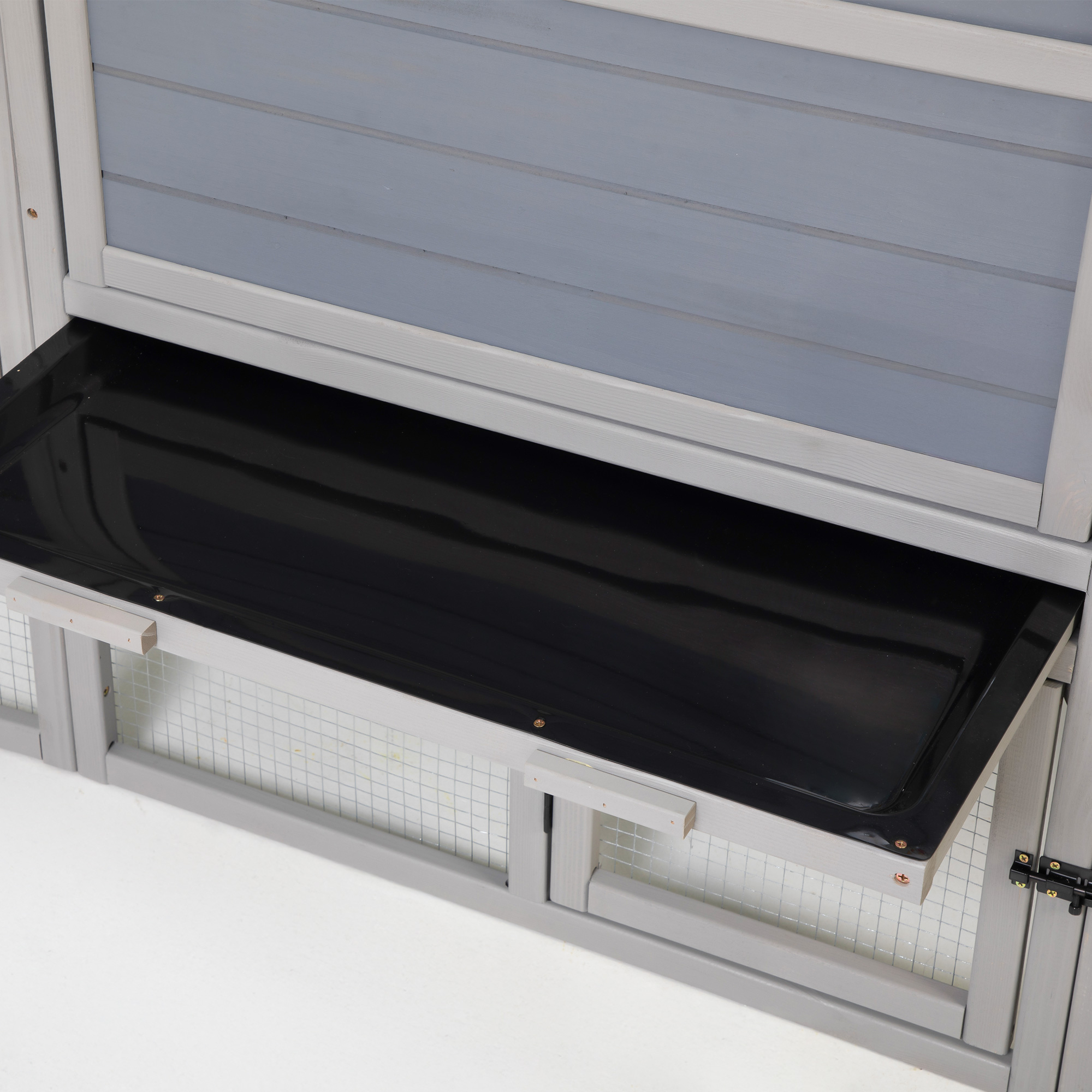Color: Gray with Colorful Patterns Material: Pinewood + Galvanized Mesh + Asphalt + PC Sun Board Overall Dimensions: 82.28"L x 25.6"W x 44.88"H Nesting Box (with the bottom mesh): 22.83"L x 14.57"W x 30.31"H Main House with Sleeping Area: 31.02"L x 25.6"W x 44.88"H Large Run: 39.37"L x 21.85"W x 28.94"H Window of Sleeping Area: 11.42"L x 7.48"W Front Door of Sleeping Area: 25.8"L x 19.7"W Pull-Out Tray: 25.8"L x 21.26"W Openable Top of Run: 21.85"L x 19.3"W Side Wood Door: 16.93"L x 12.2"W Panel with Colorful Patterns: 24.02"L x 9.3"W Net Weight: 61.73 lbs