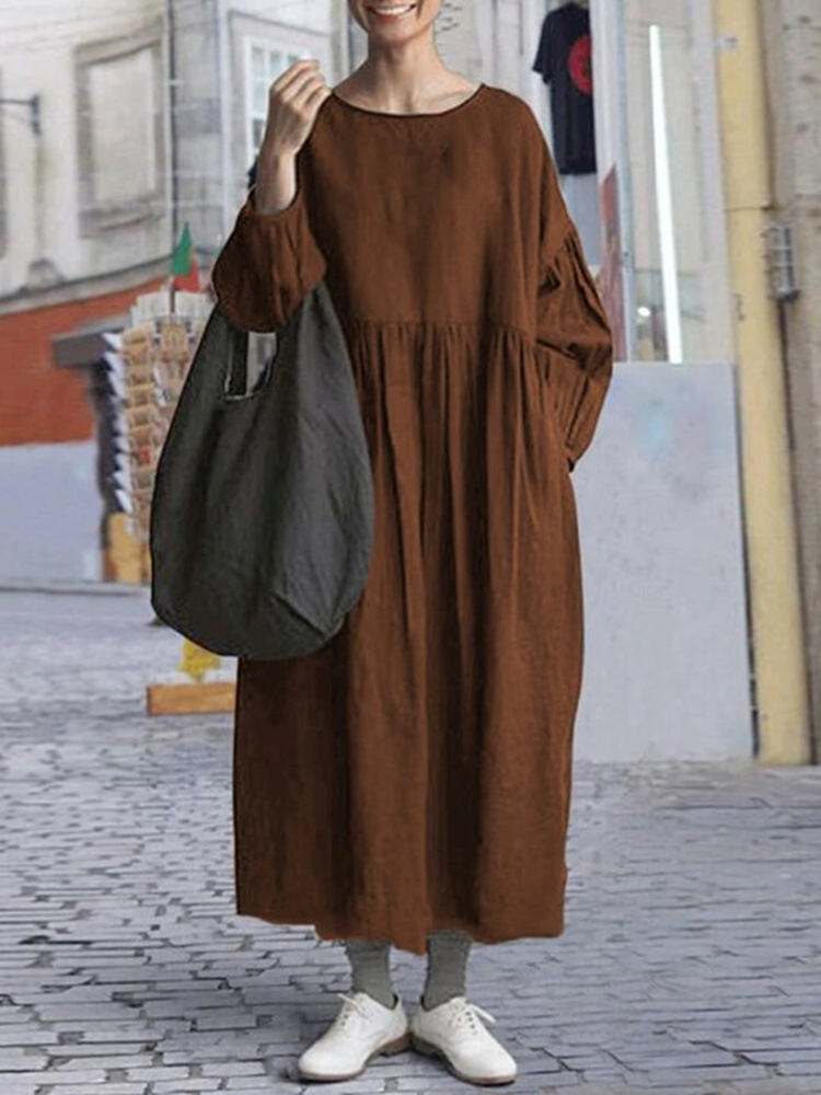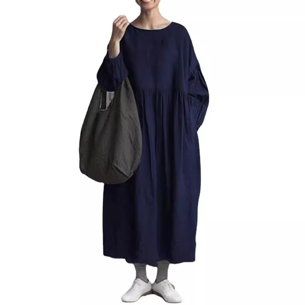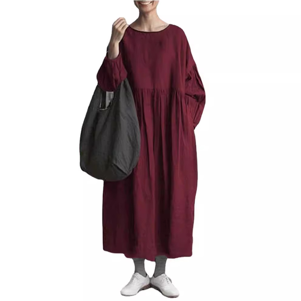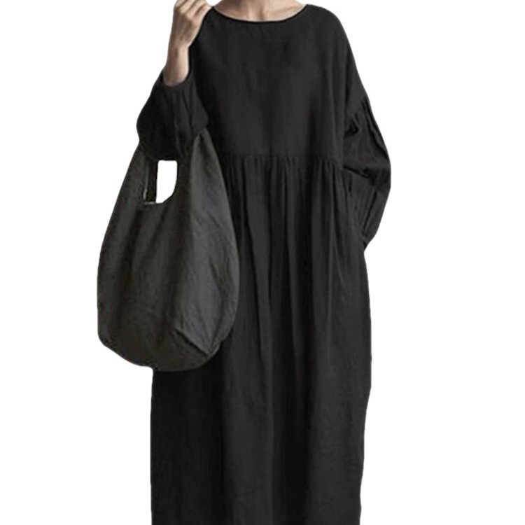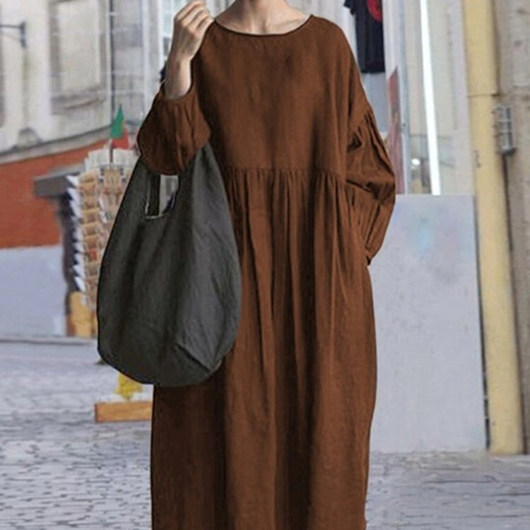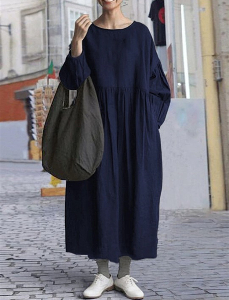 Round Neck Long Sleeve Cotton Linen Long Patchwork Dress